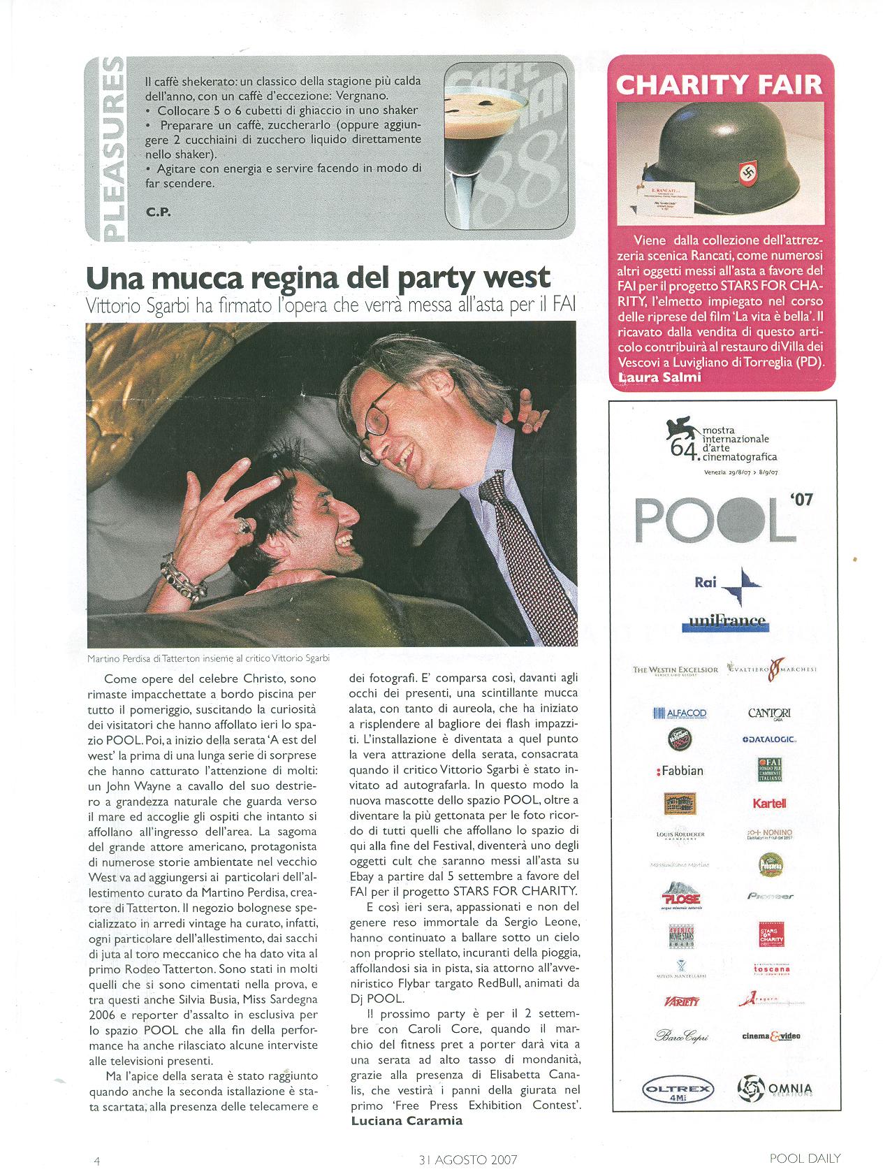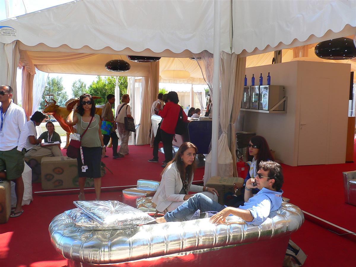 Importante la presenza di Tatterton anche per quanto riguarda l'organizzazione delle feste. Il primo appuntamento è per la sera del 30 agosto, con una serata in tema western, con tanto di balle di fieno e divani Chesterfield, presi in prestito da un set di Oliviero Toscani. Momento clou della serata è il rodeo sul toro meccanico, per cui la Tatterton che ha allestito lo spazio mette in palio un oggetto della sua collezione.