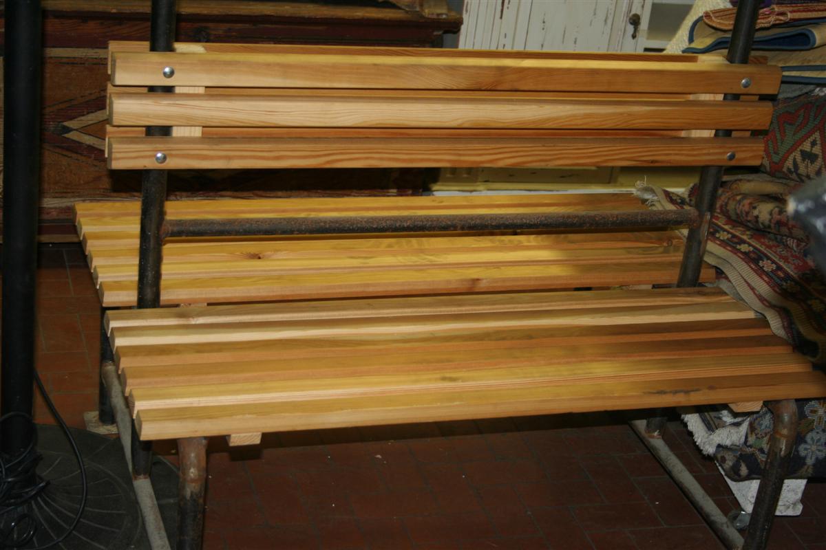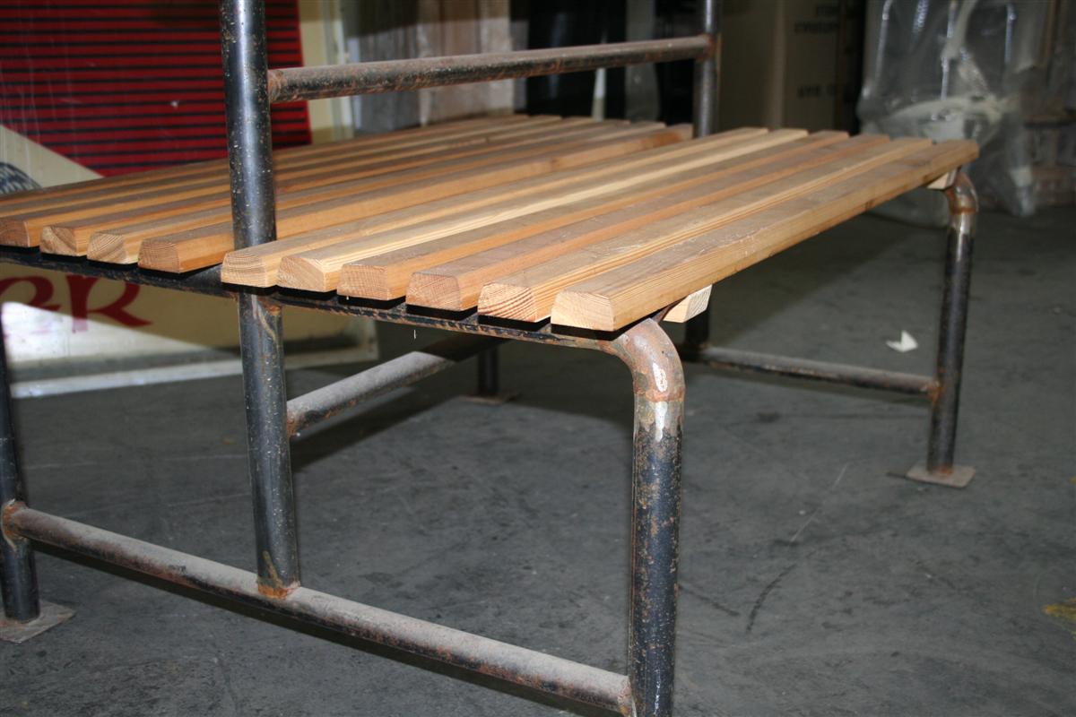 G&H Tatterton Best antique store Panchina bifacciale da spogliatoio piccola in ferro e legno di tek, completa portaborse nella parte superiore. Modello scolastico anni '60.