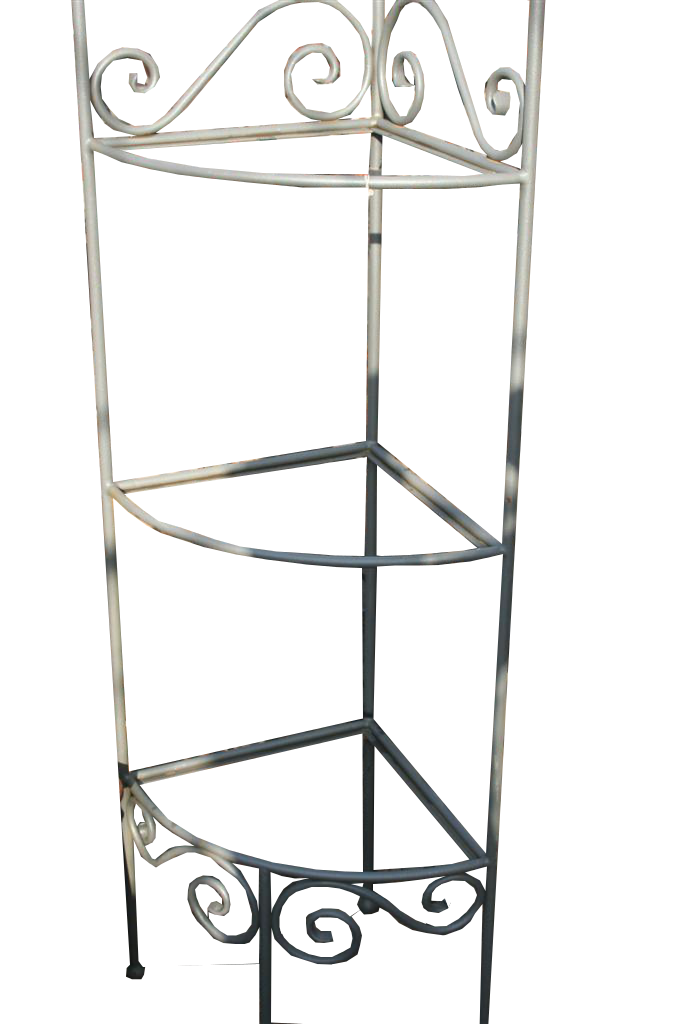 Piccola angoliera portavasi a giorno in ferro battuto con ricci.