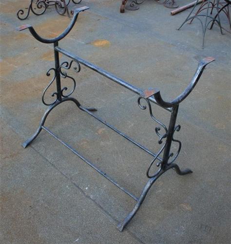 Tavolo marocchino ovale con piano in mosaico di ceramica blu e base in ferro con ricci. Da giardino.