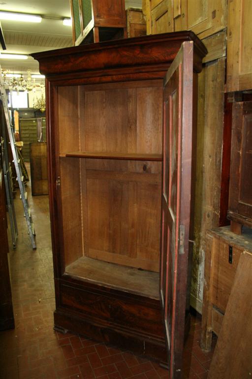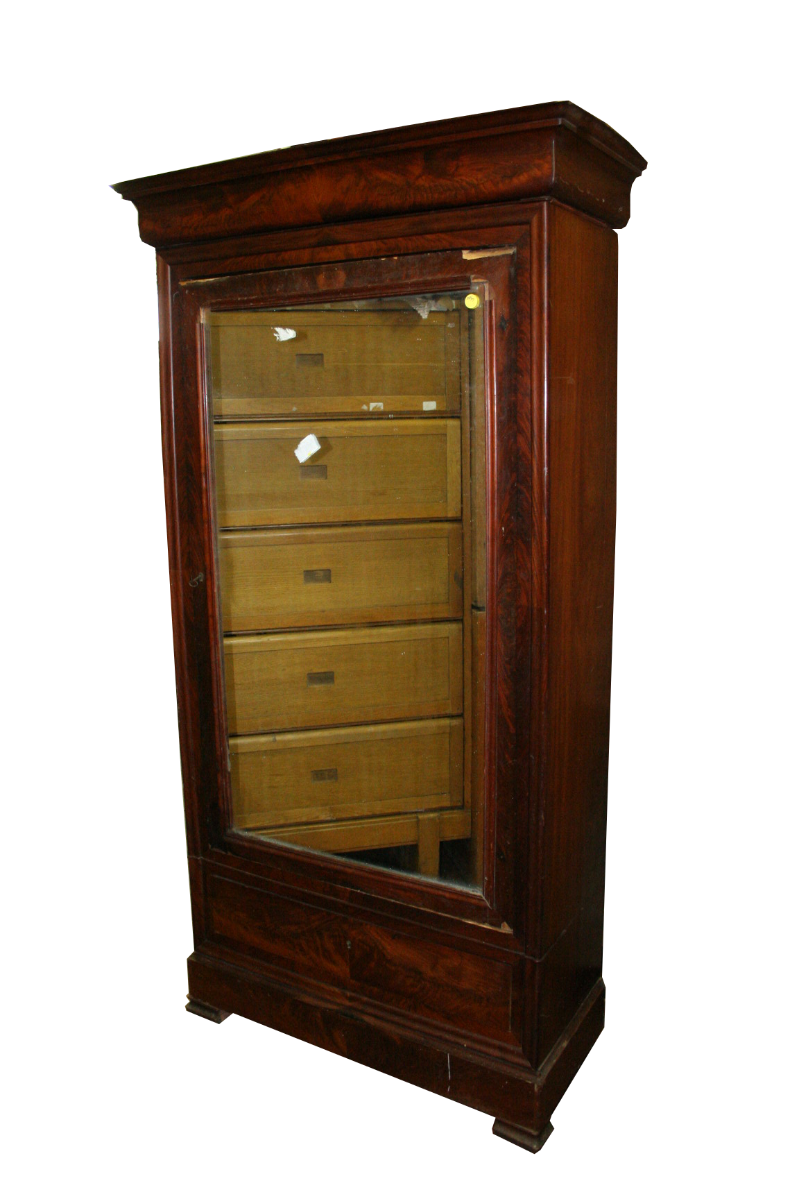 Armadio decò in radica di noce nazionale, con anta a specchio e un cassetto alla base.