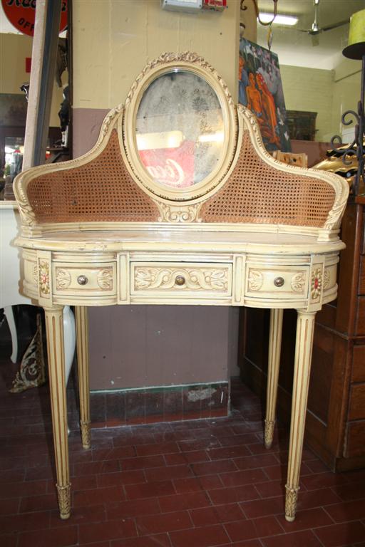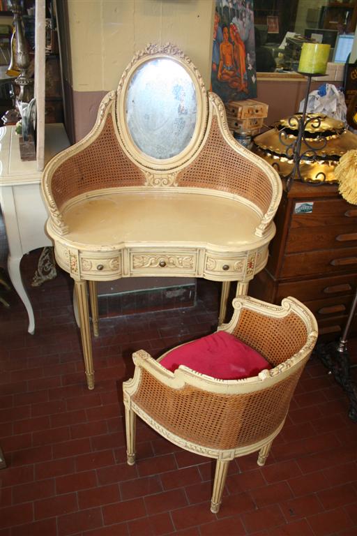 G&H Tatterton Best antique store Piccola pettineuse in stile con gambe tornite e paglia di vienna. Dispone di tre cassetti e di una specchiera ovale basculante, con vetro originale. È corredata di poltroncina abbinata con cuscino bordeaux.