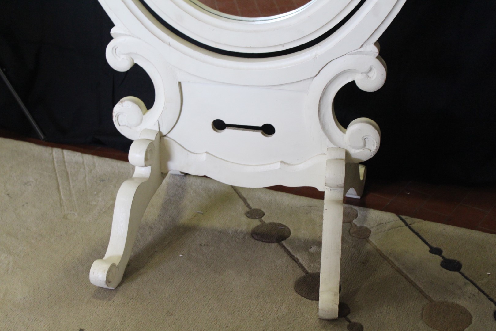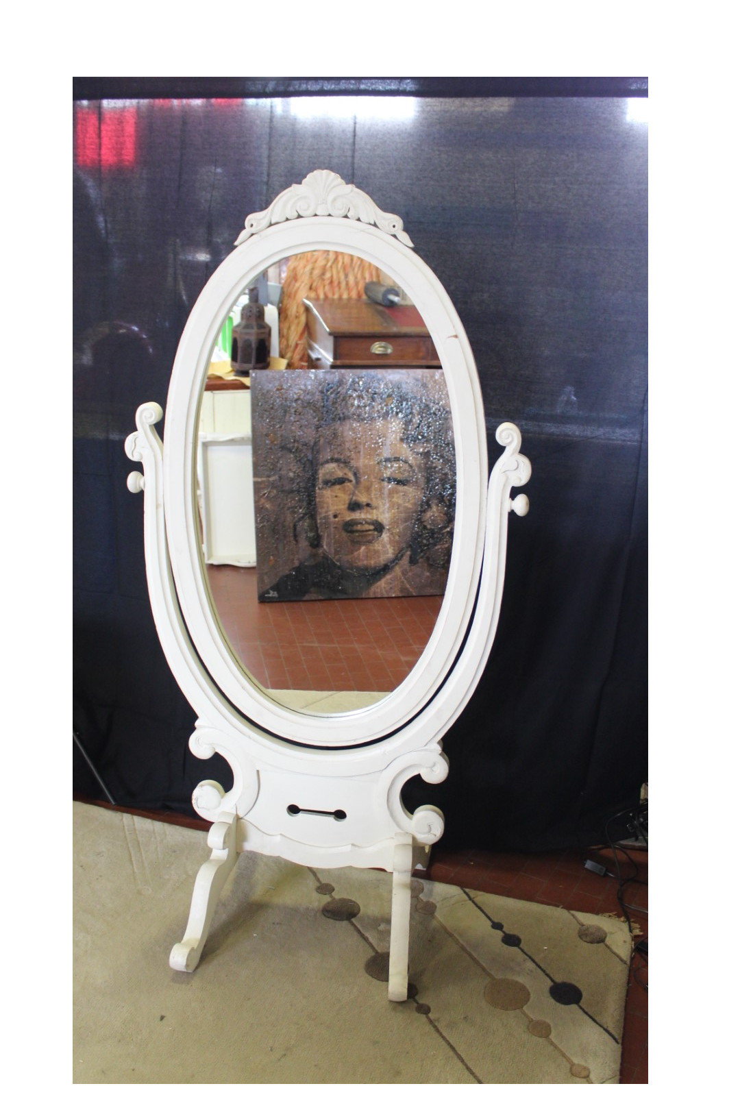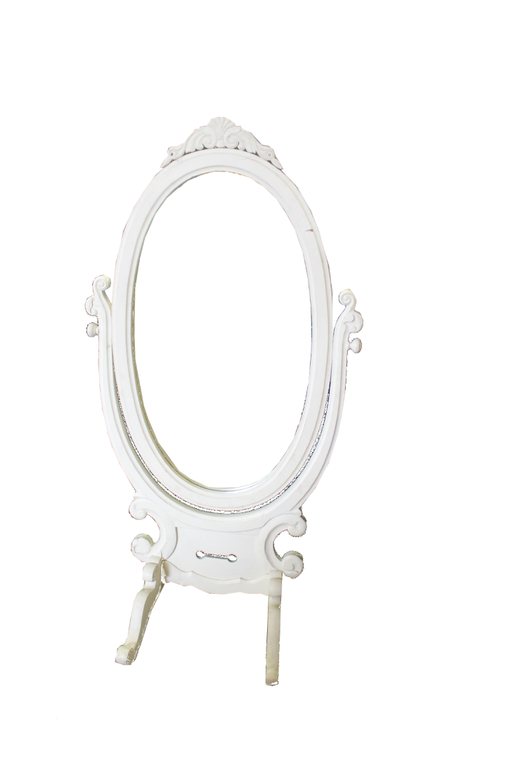 Specchiera ovale basculante provenzale. La specchiera è dotata di gambe, in legno massello laccata bianca.