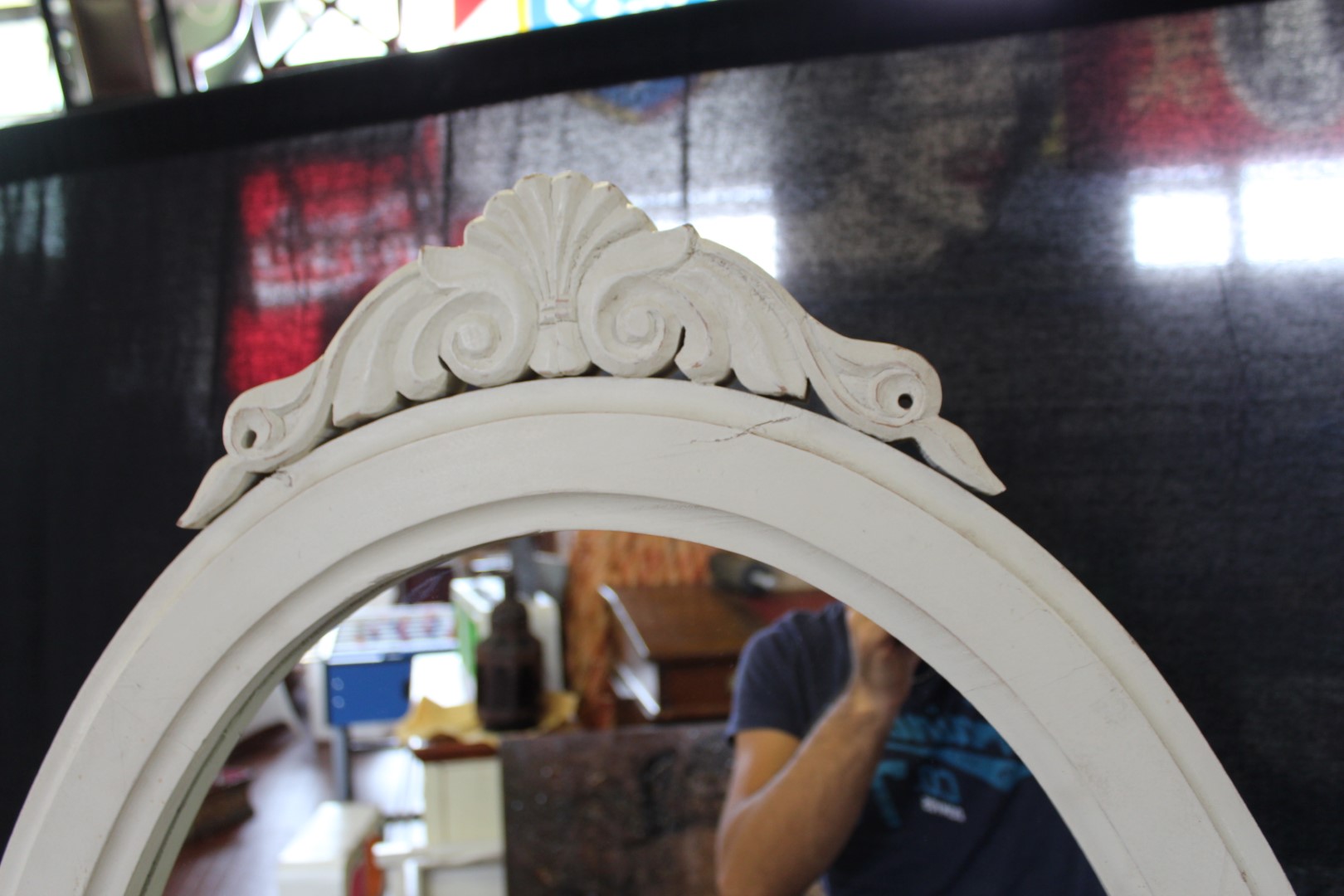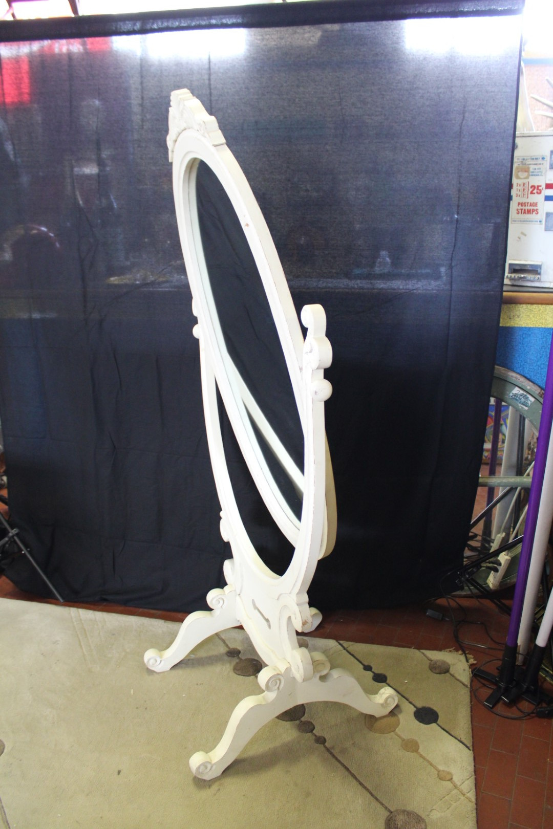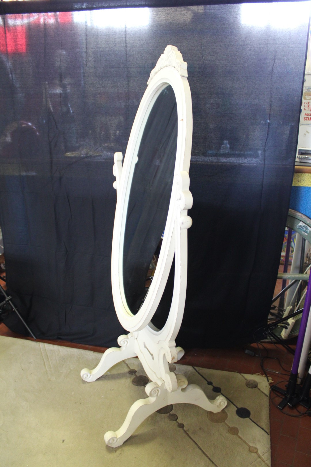 Specchiera ovale basculante provenzale. La specchiera è dotata di gambe, in legno massello laccata bianca.