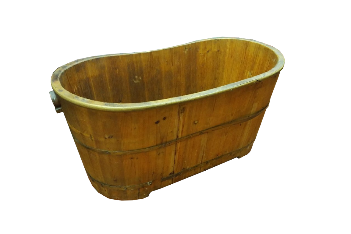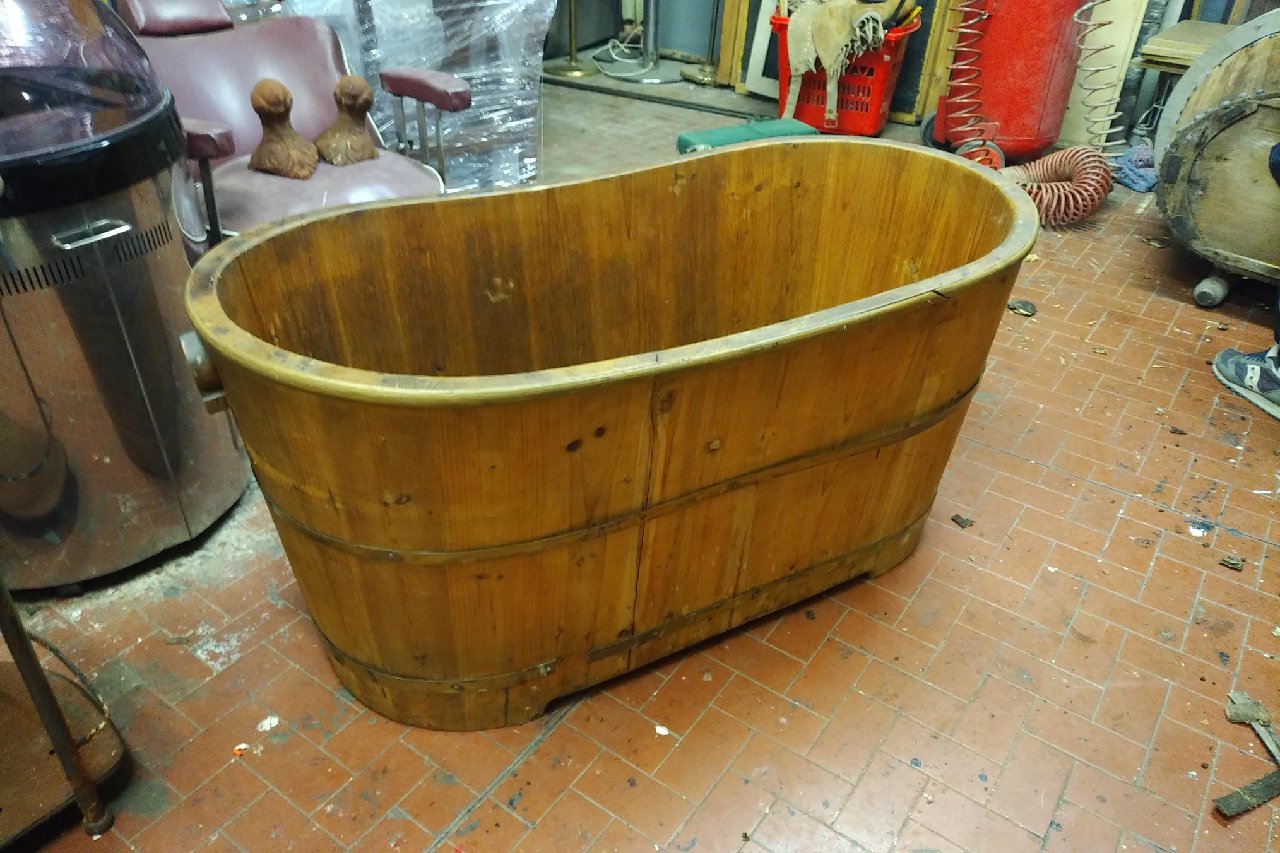 Piccola vasca a doghe in legno dolce con bordatura in ottone