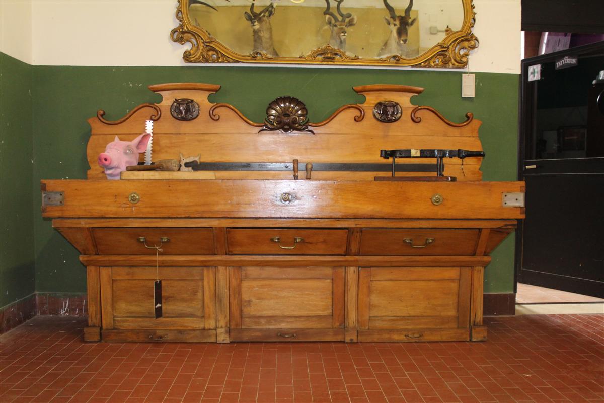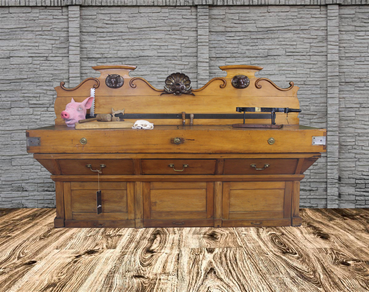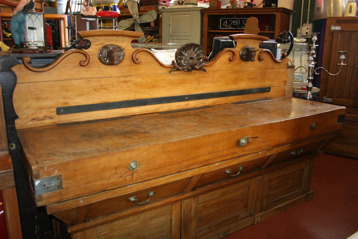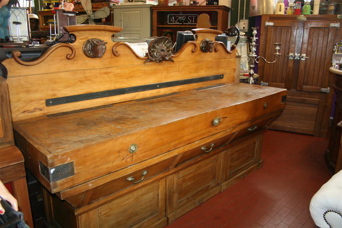 G&H Tatterton Best antique store Grande billot in quercia francese dell'800, con cimasa a conchiglia e teste di toro in ferro.