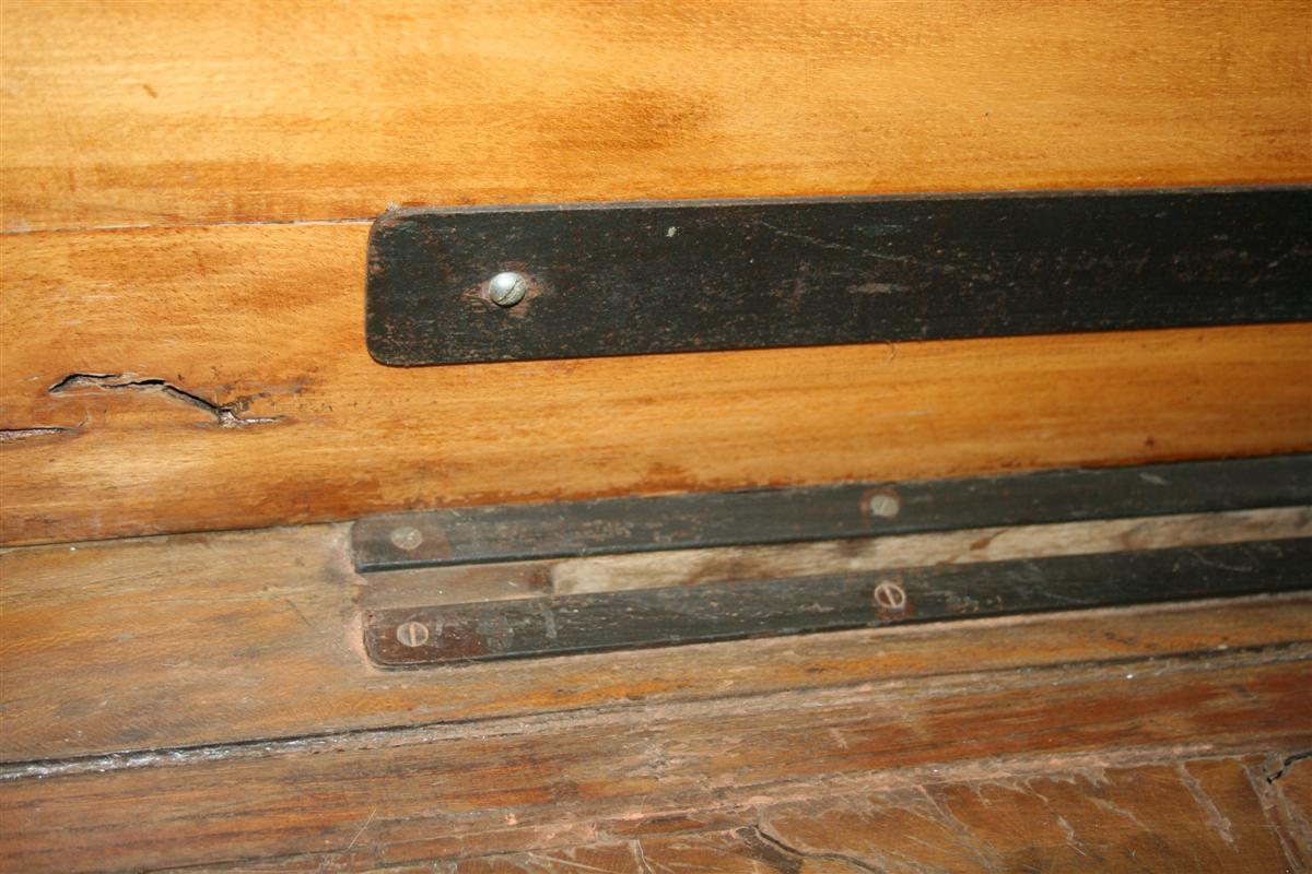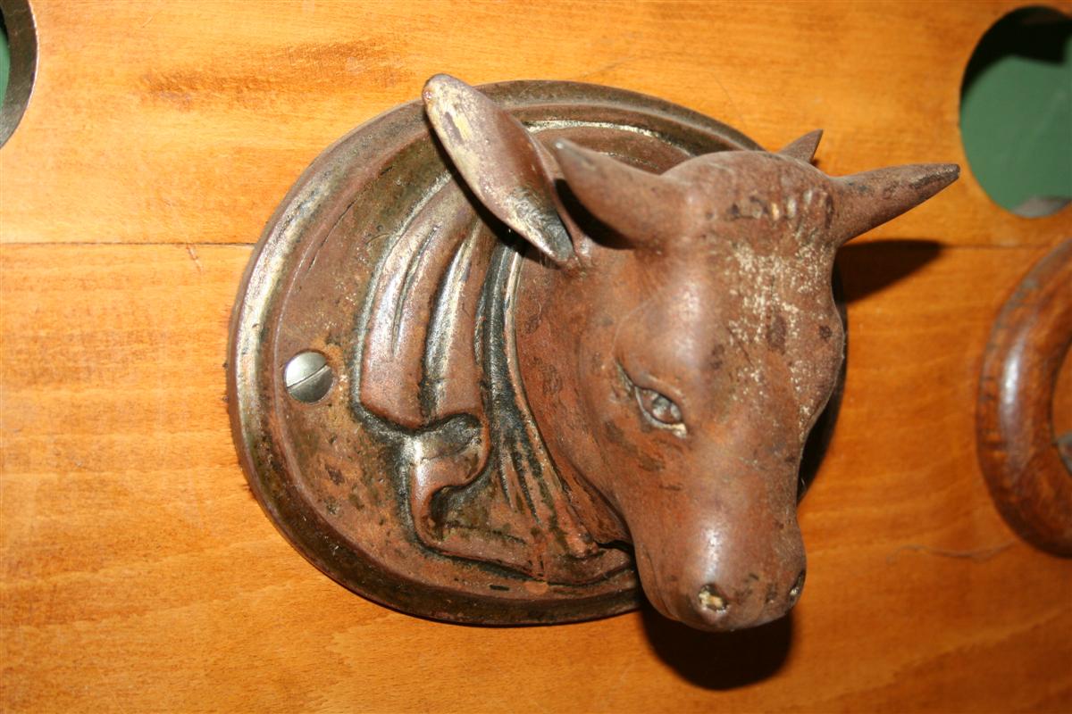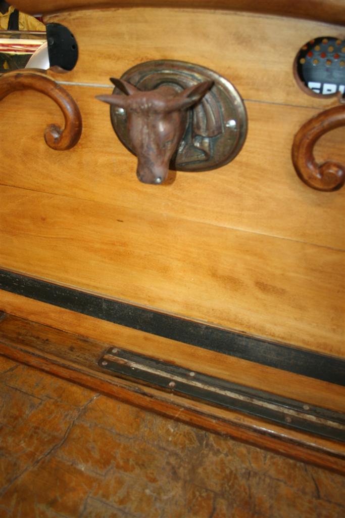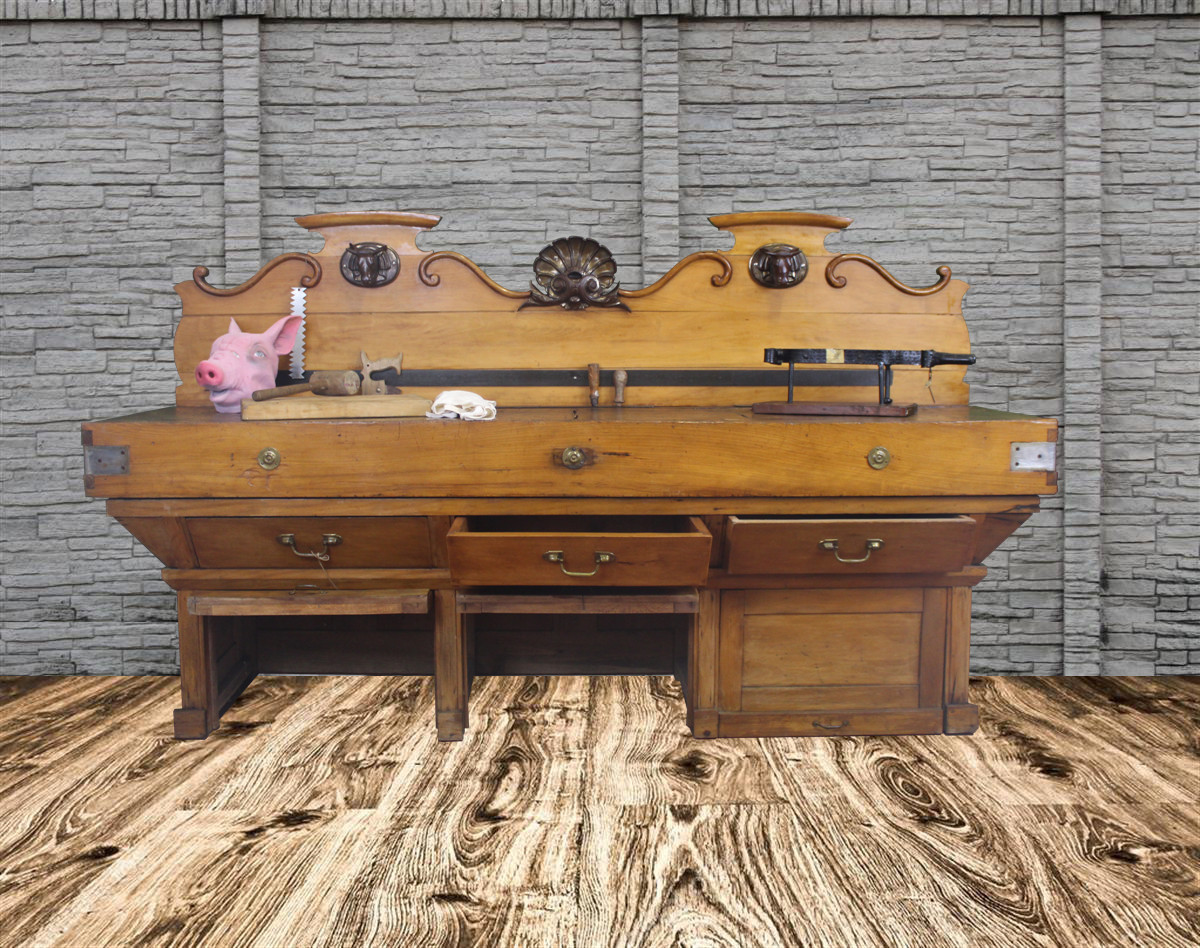 G&H Tatterton Best antique store Grande billot in quercia francese dell'800, con cimasa a conchiglia e teste di toro in ferro.