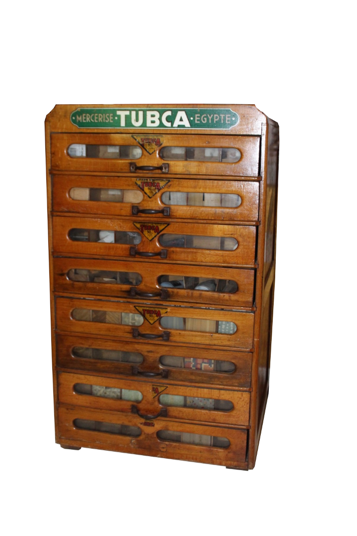 Piccola cassettiera espositore francese in rovere da merceria. Marchiata Tubca.