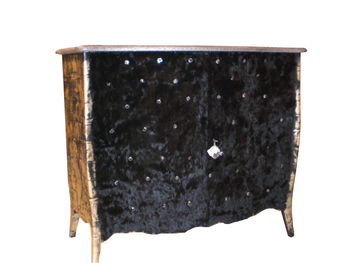 Credenza bassa in pelle dorata, con ante in pelliccia con Swarovski e piano in piombo ribattuto.