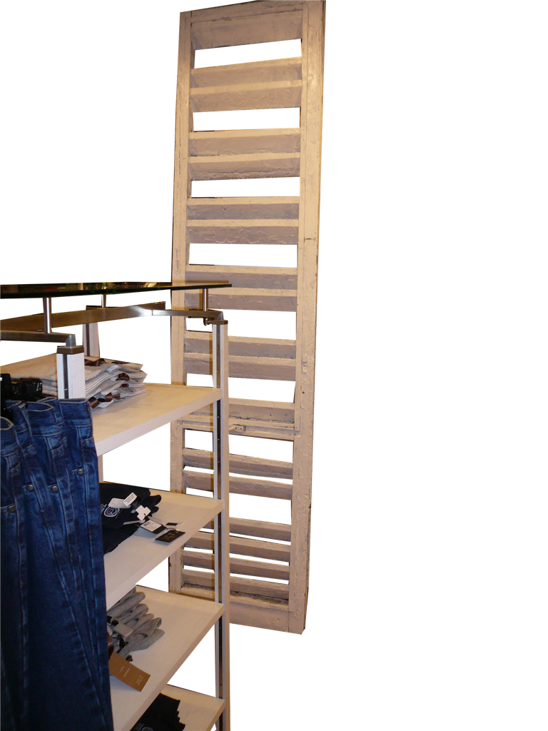 Espositore per cinture ed accessori creato con persiana rustica da esterno riadattata. Decapata a mano, modello grande.