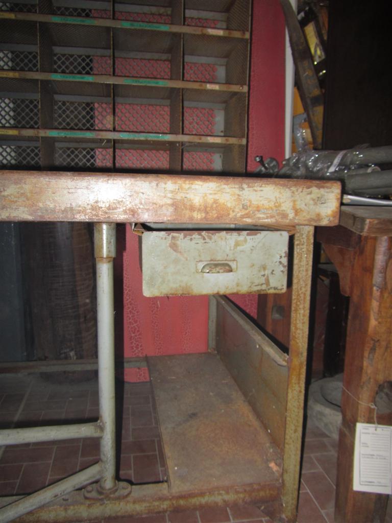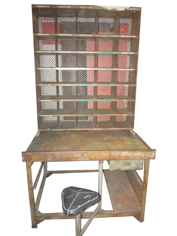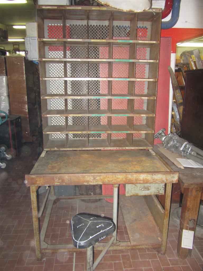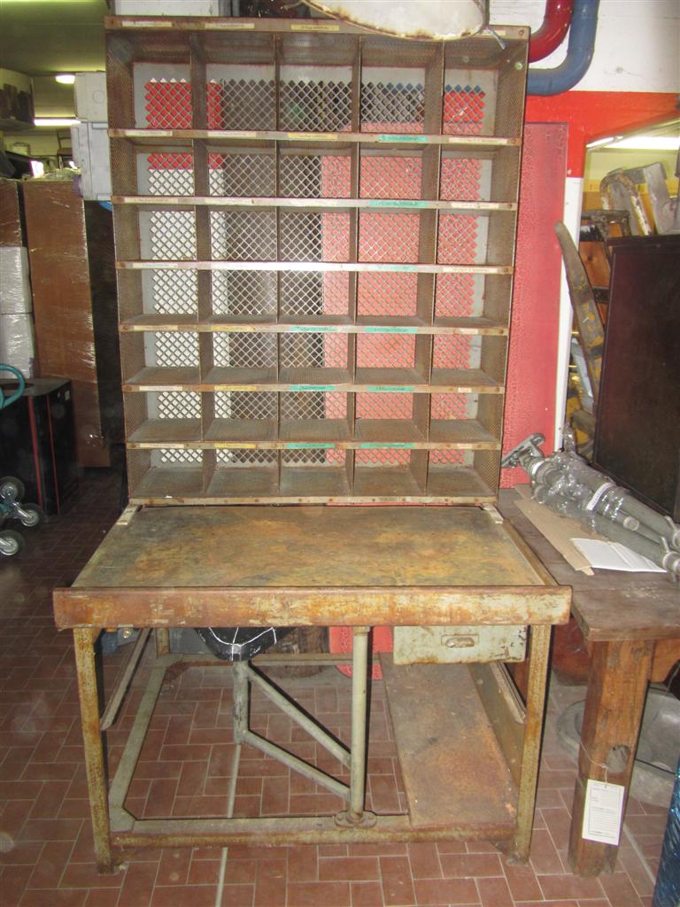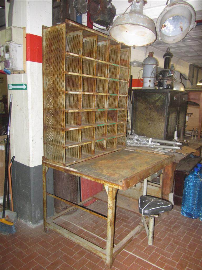 G&H Tatterton Best antique store Mobile scrittoio francese in ferro con alzata portalettere e sgabellino estraibile rivestito in pelle. Proveniente da un vecchio ufficio postale provenzale.