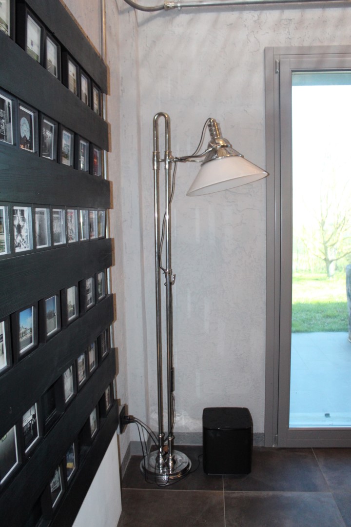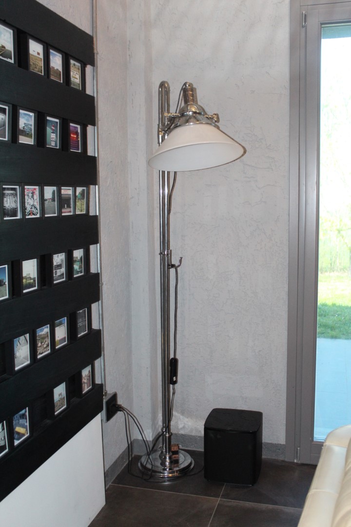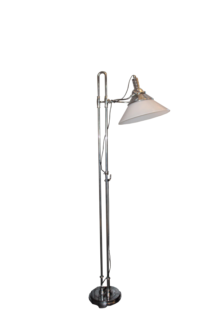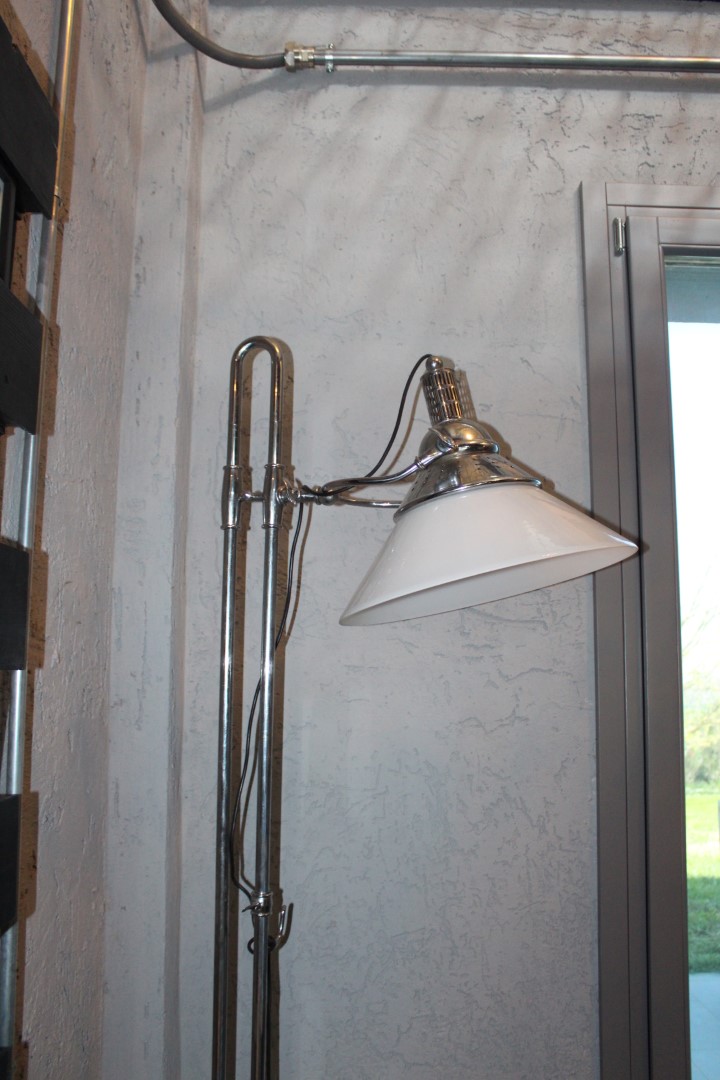 Lampada piantana da terra, in ottone cromato con cappello in vetro bianco latte. Enea