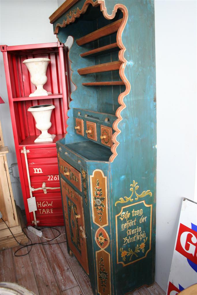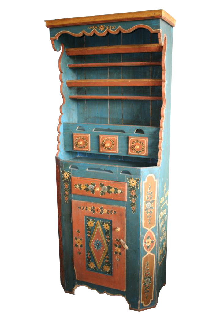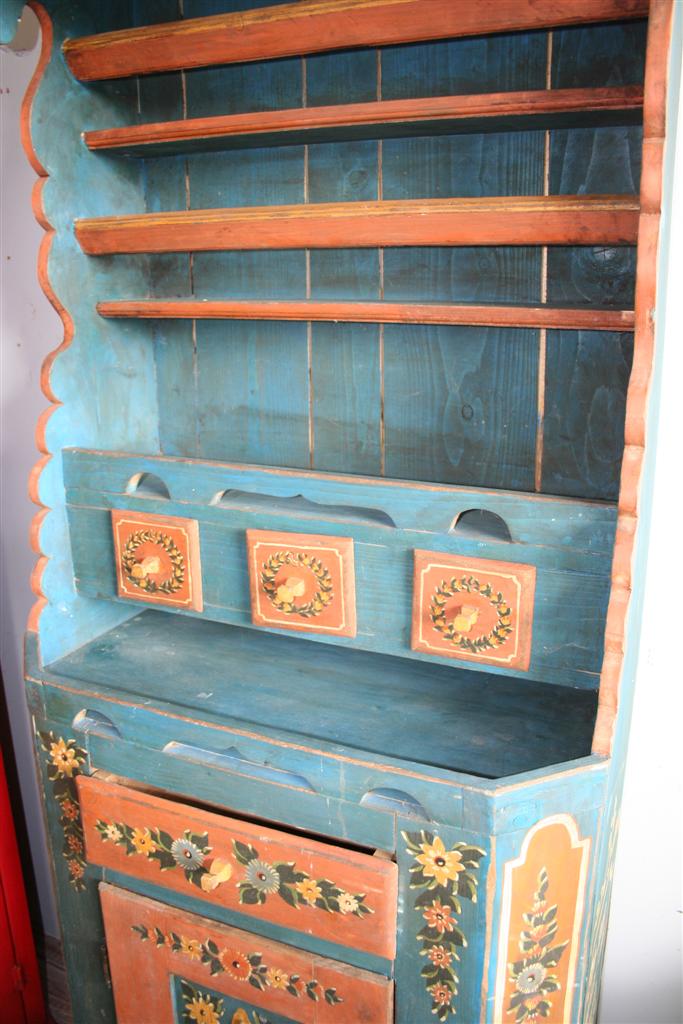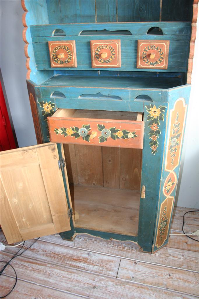 Credenzina rustica tirolese con alzata a giorno, dipinta e decorata a mano.