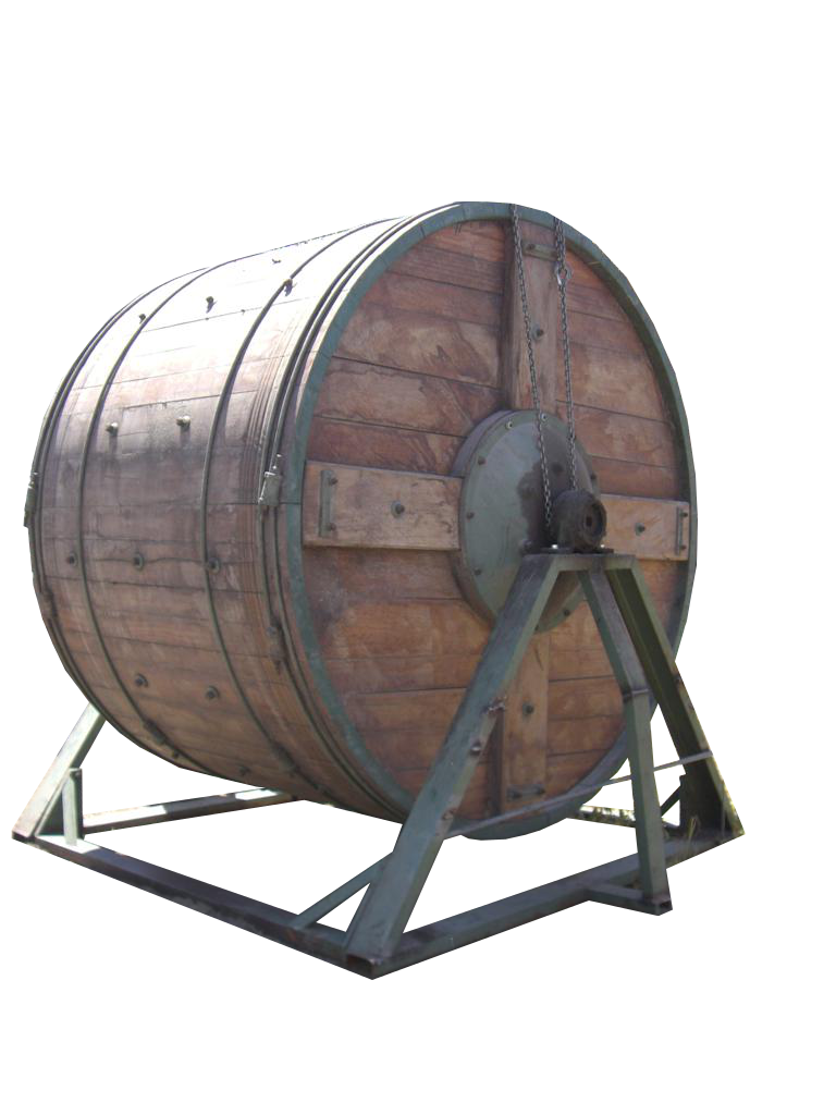 Grande bottale vintage in legno. Il bottale viene utilizzato nella concia delle pelli. Costruito in legno, come una botte, è formato da doghe in legno stagionato rinforzate da cerchi in ferro.