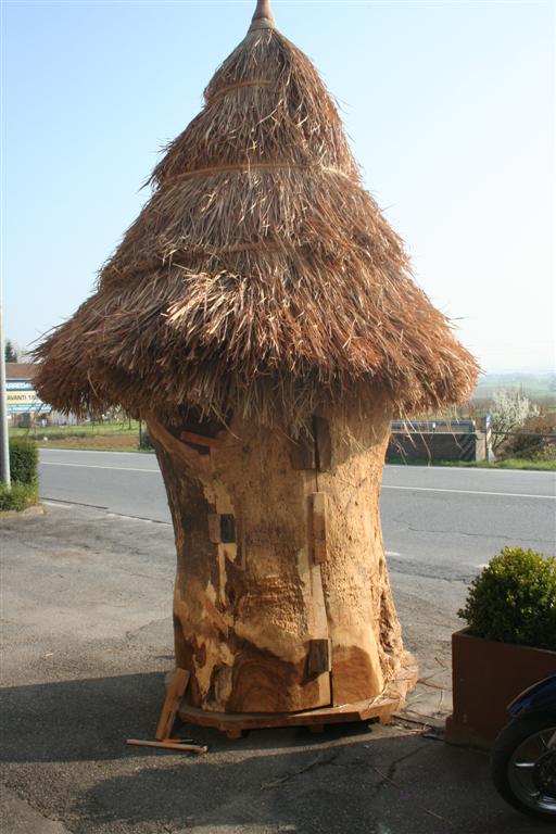 Casetta in legno con tetto in paglia, creata con un unico tronco scavato internamente.