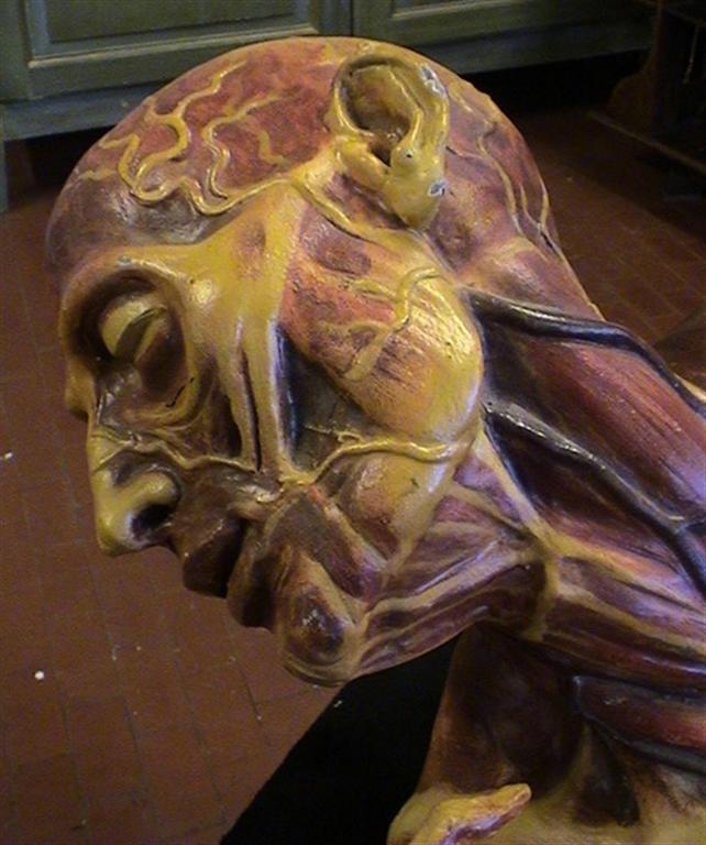G&H Tatterton Best antique store Modello anatomico ospedaliero in legno vintage di corpo umano senza pelle, con muscoli e sistema vascolare ben visibili. Provienente dai magazzini delle vecchie officine ortopediche dell'ospedale Rizzoli di Bologna.