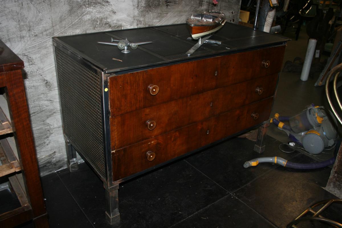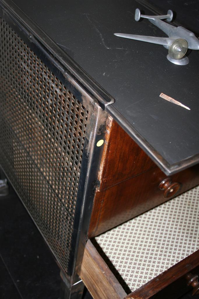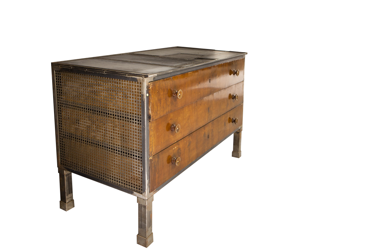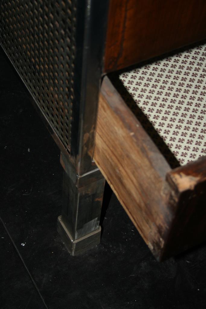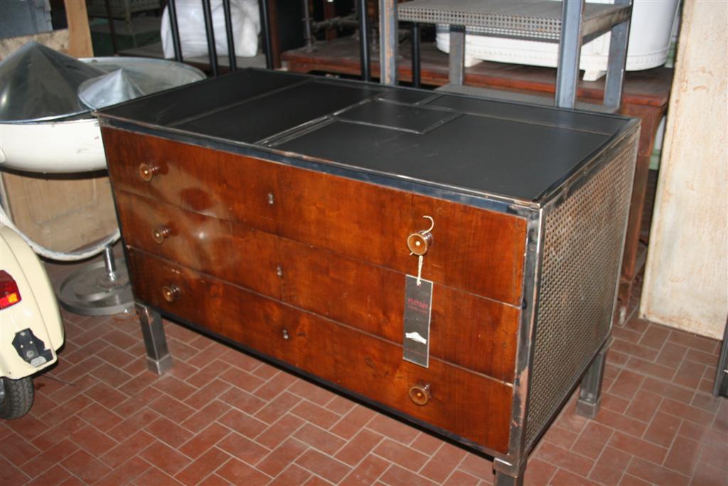 Comò in ferro stile impero, con struttura esterna in ferro e reteforata e cassetti originali di cassettiera impero.