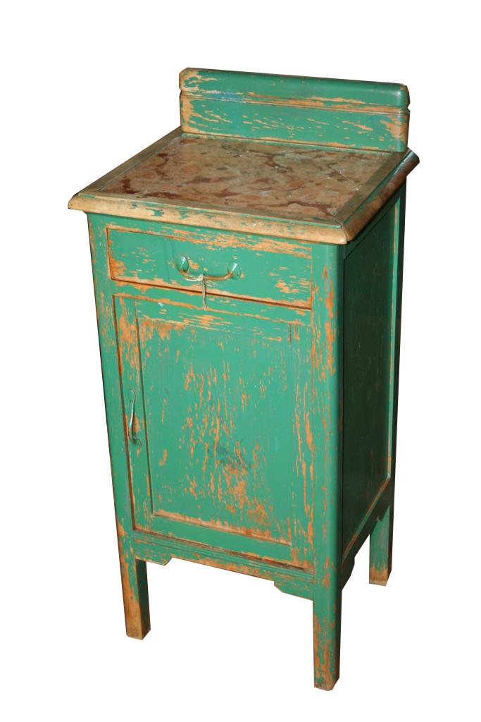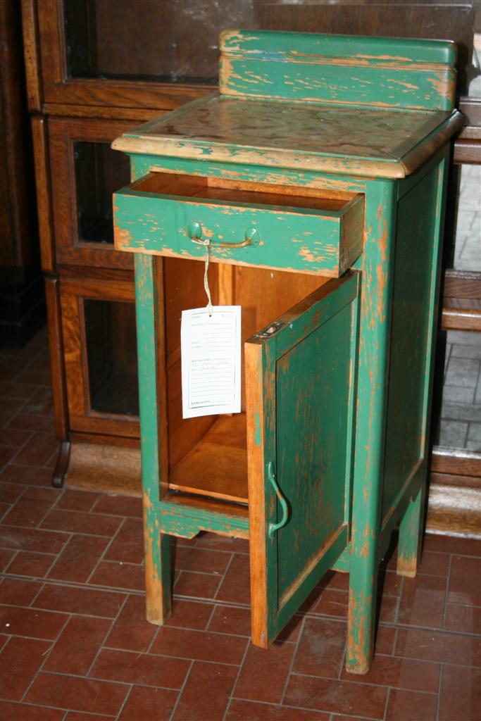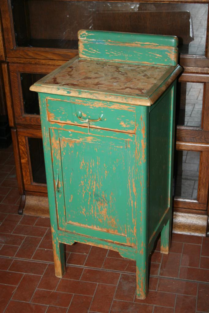Comodino in legno laccato verde, con piano in marmo rosa.
