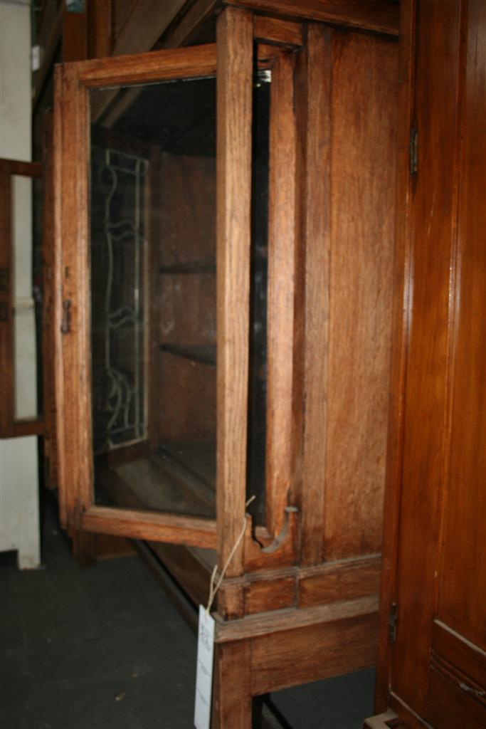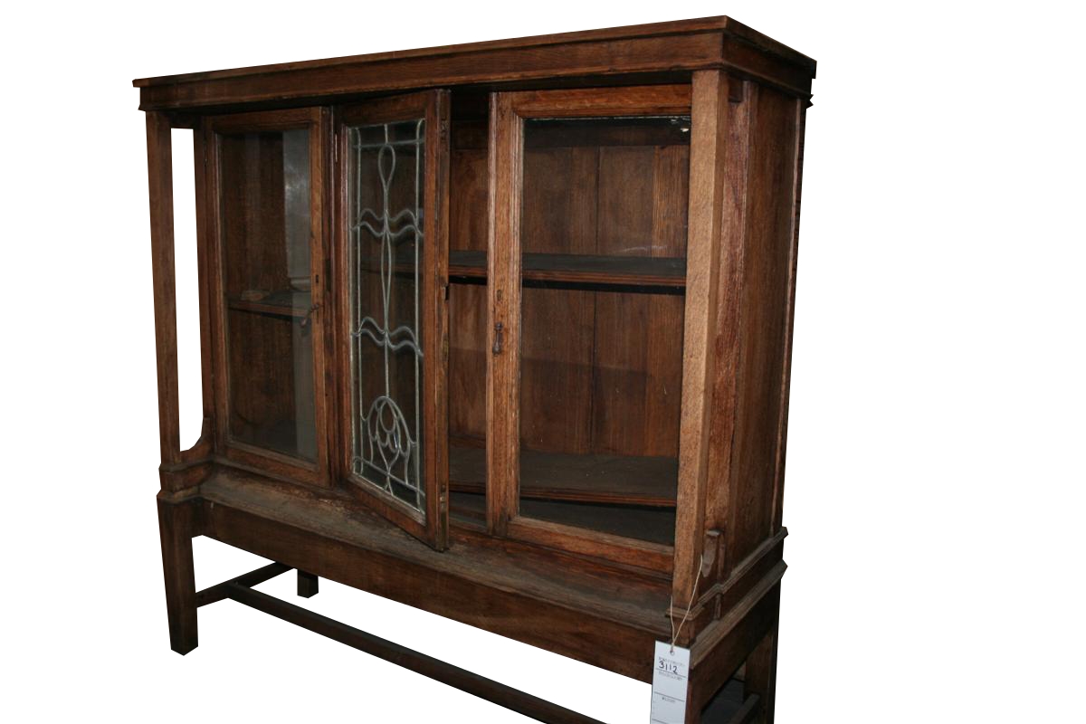 Credenza bassa in legno di quercia con vetrina e colonnine.