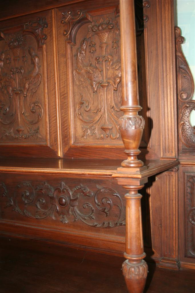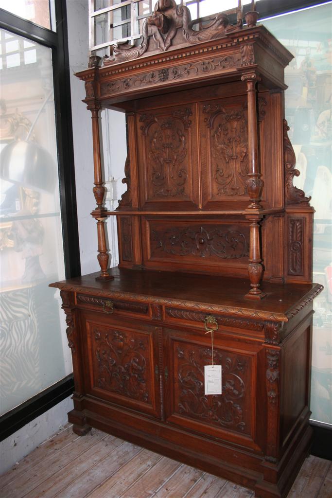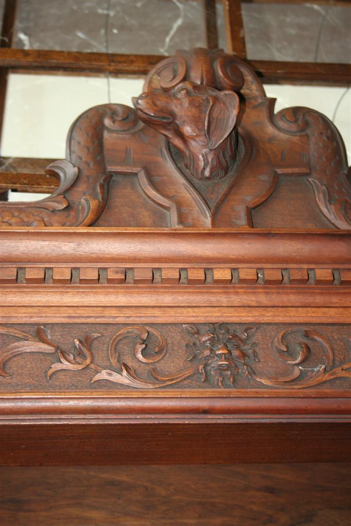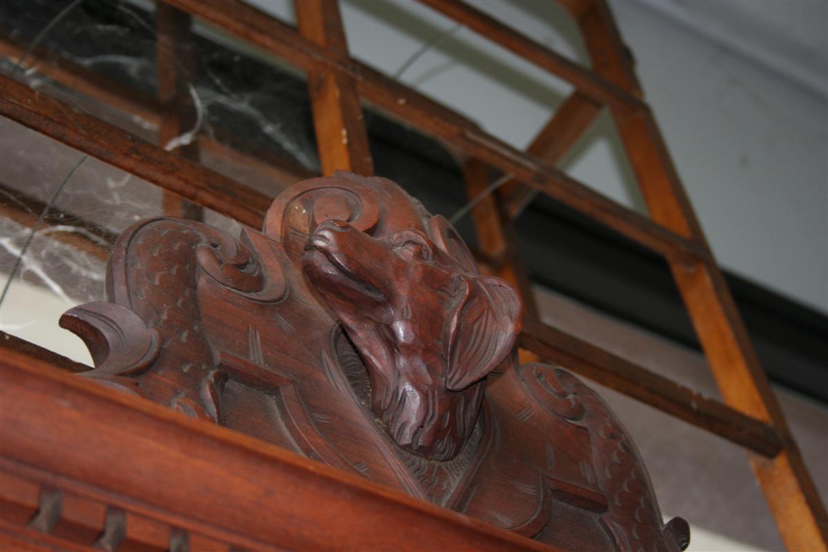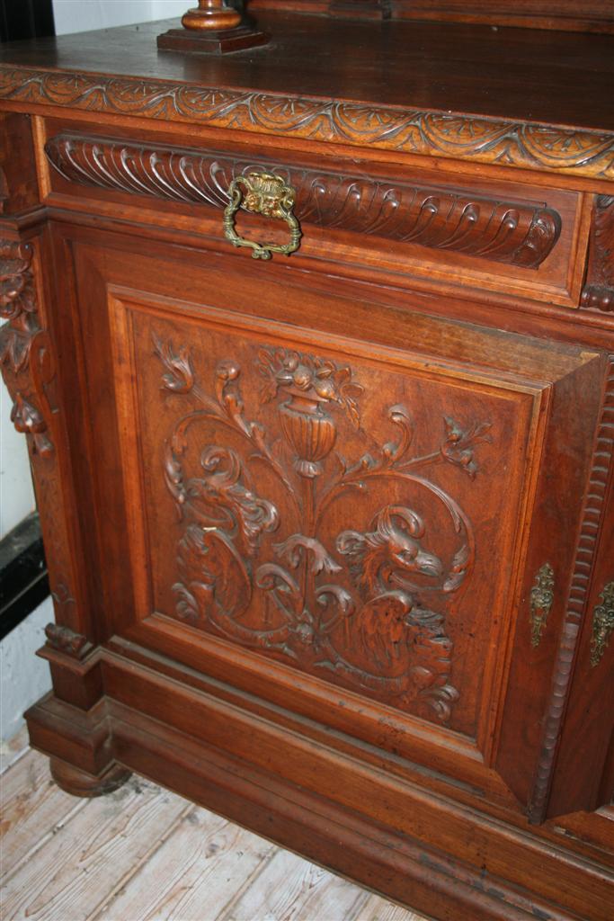 Credenza bolognese in due corpi, in noce con intagli stile caccia, etagere a giorno superiore , fine '800
