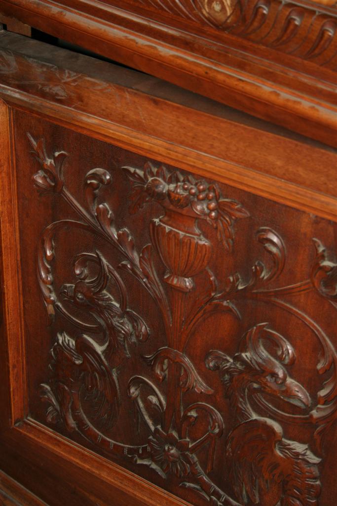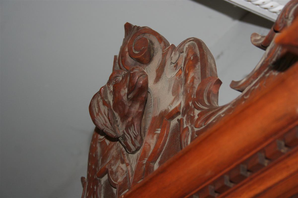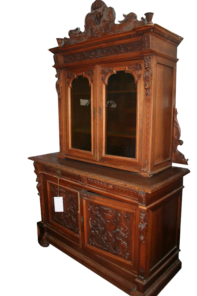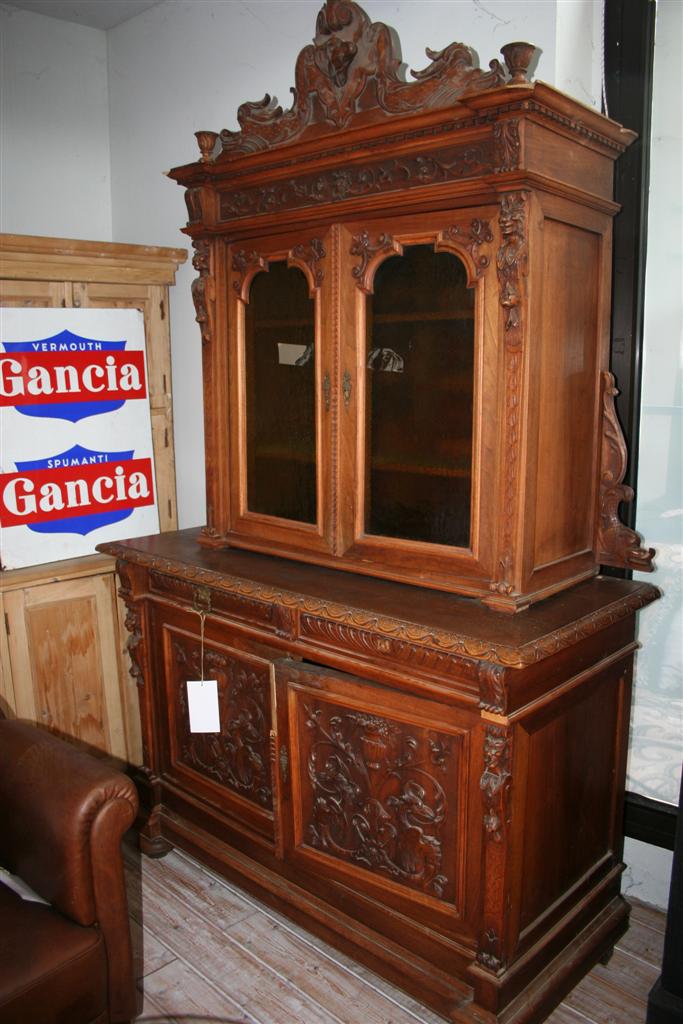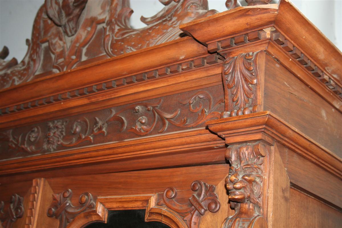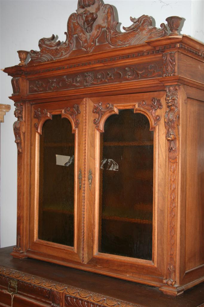 Credenza bolognese in due corpi, in noce con intagli stile caccia, vetrina nella parte superiore, fine '800
