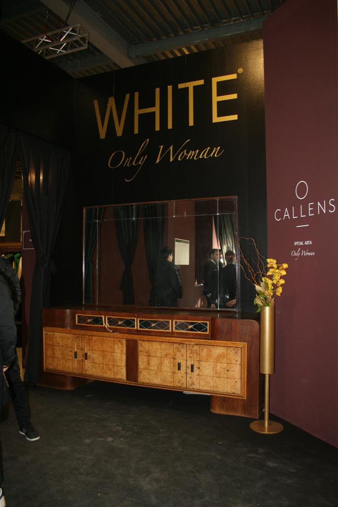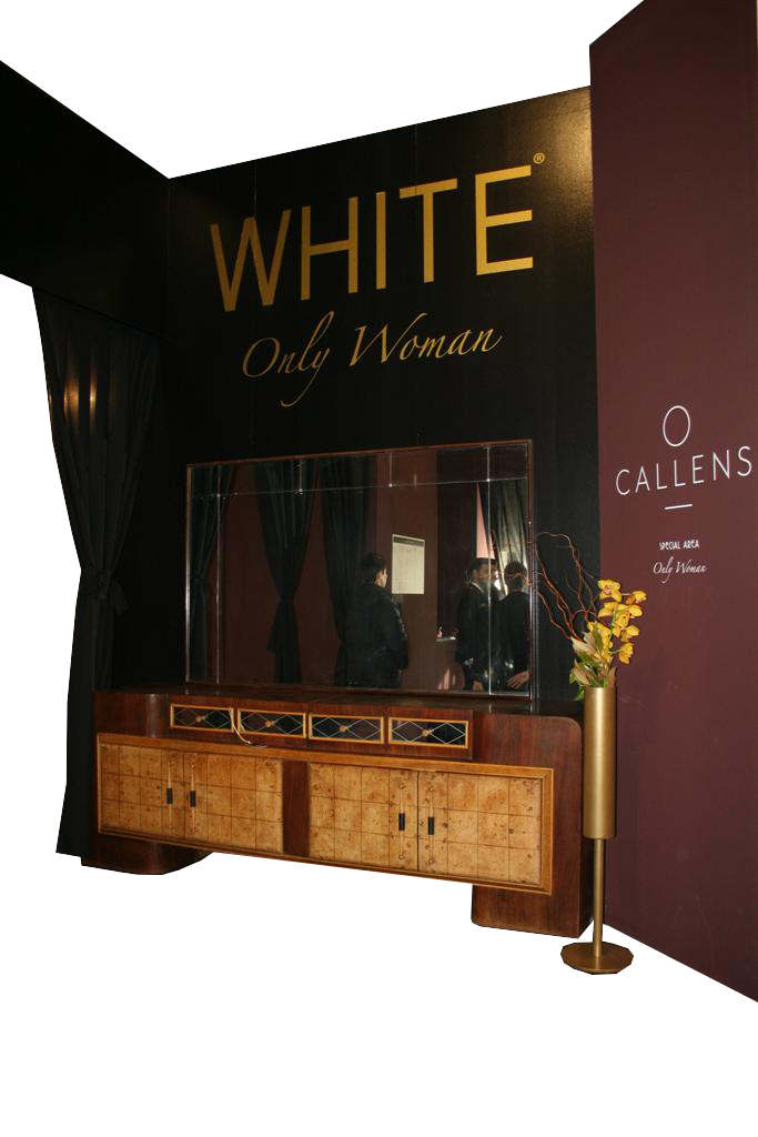 Credenza bassa decò con specchiera, impiallacciata in noce, con 4 ante in radica e 4 cassetti rivestiti di specchi.