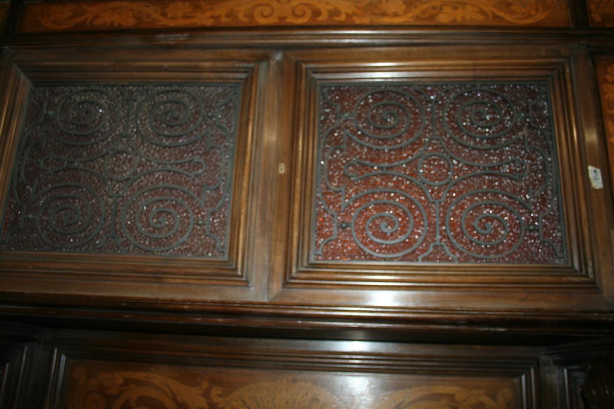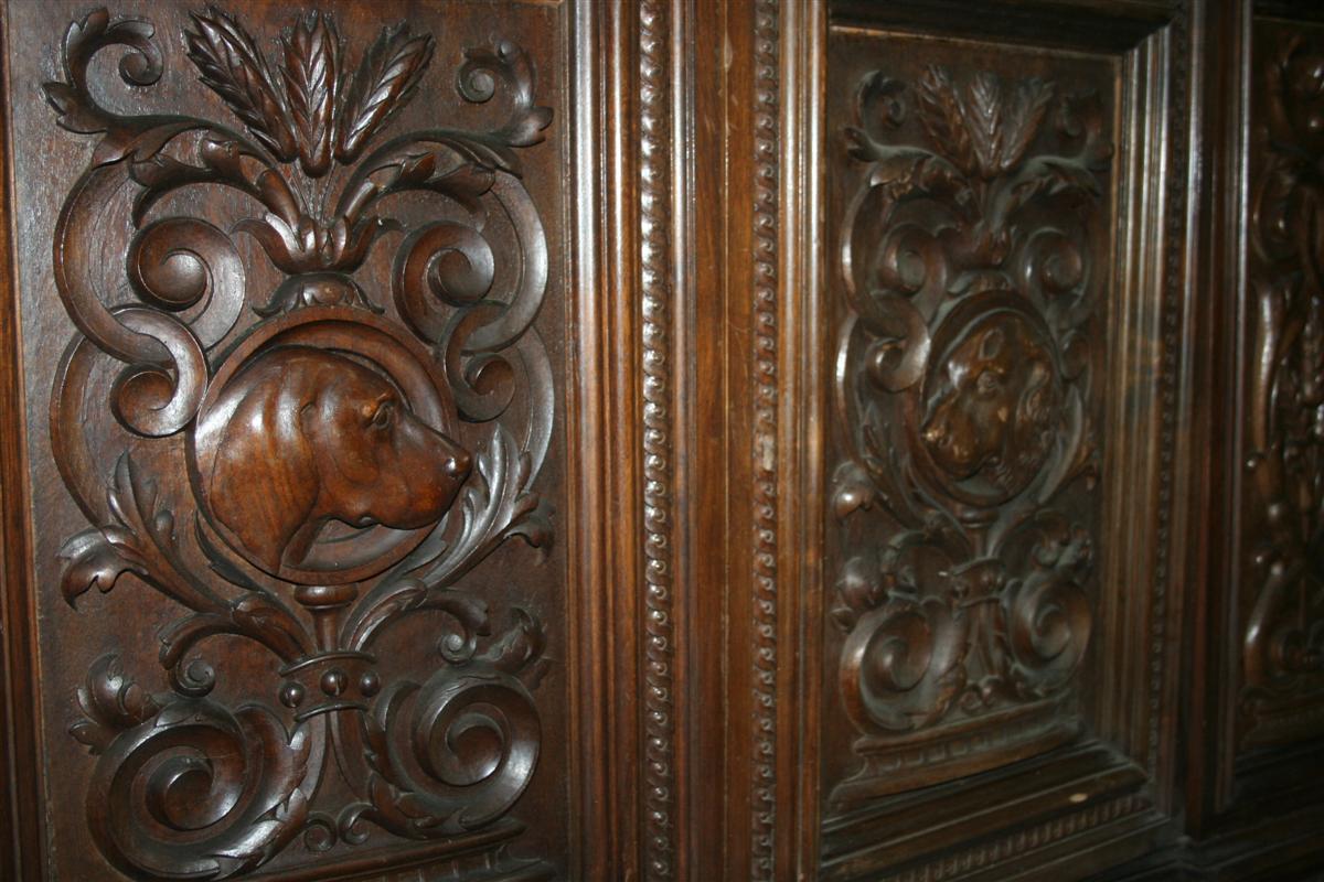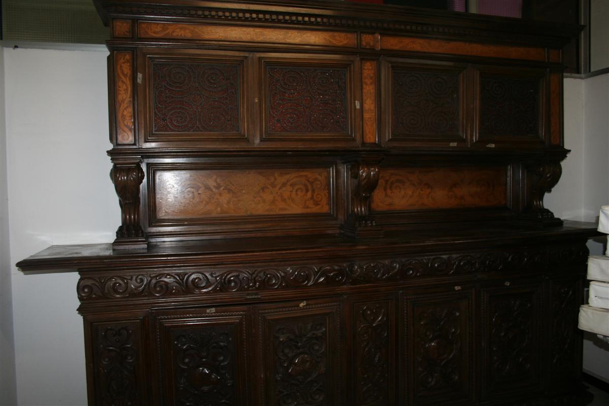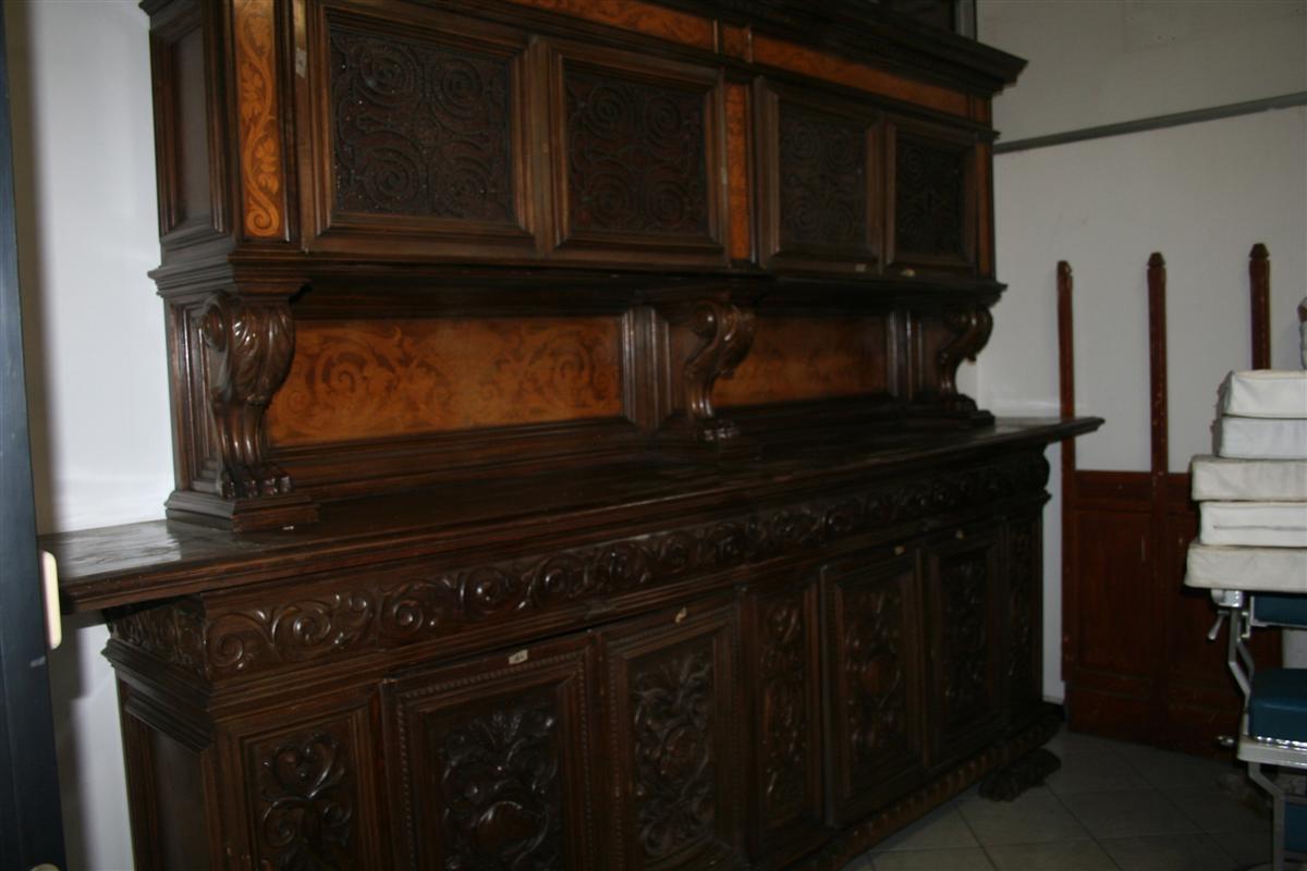 Credenza bolognese in due corpi, in noce con intagli stile caccia, vetrina nella parte superiore, fine '800