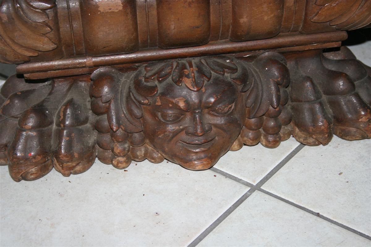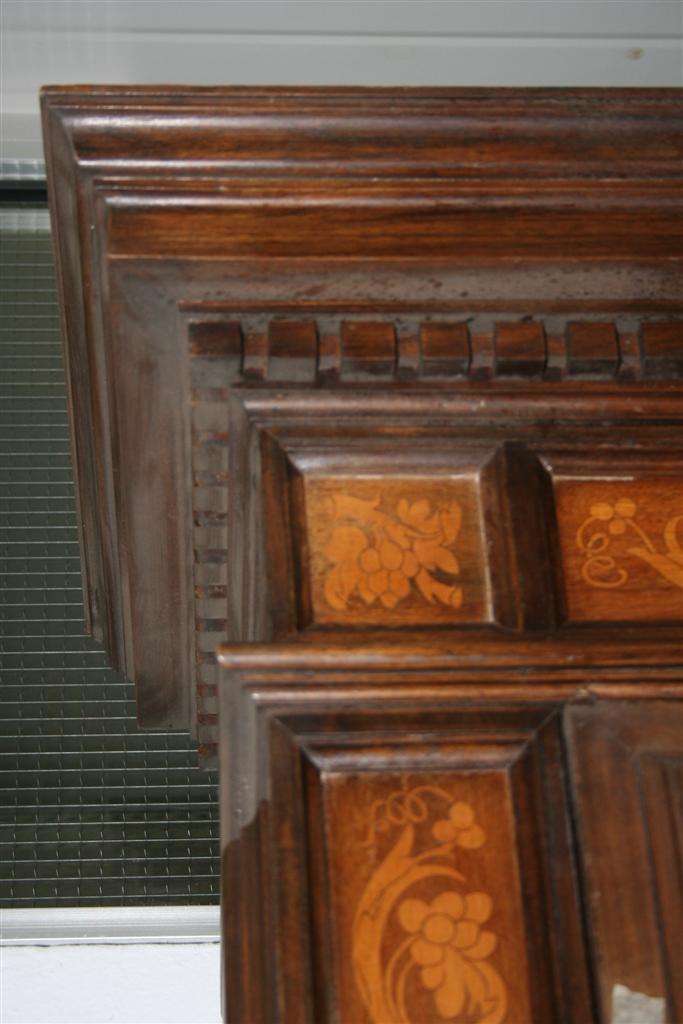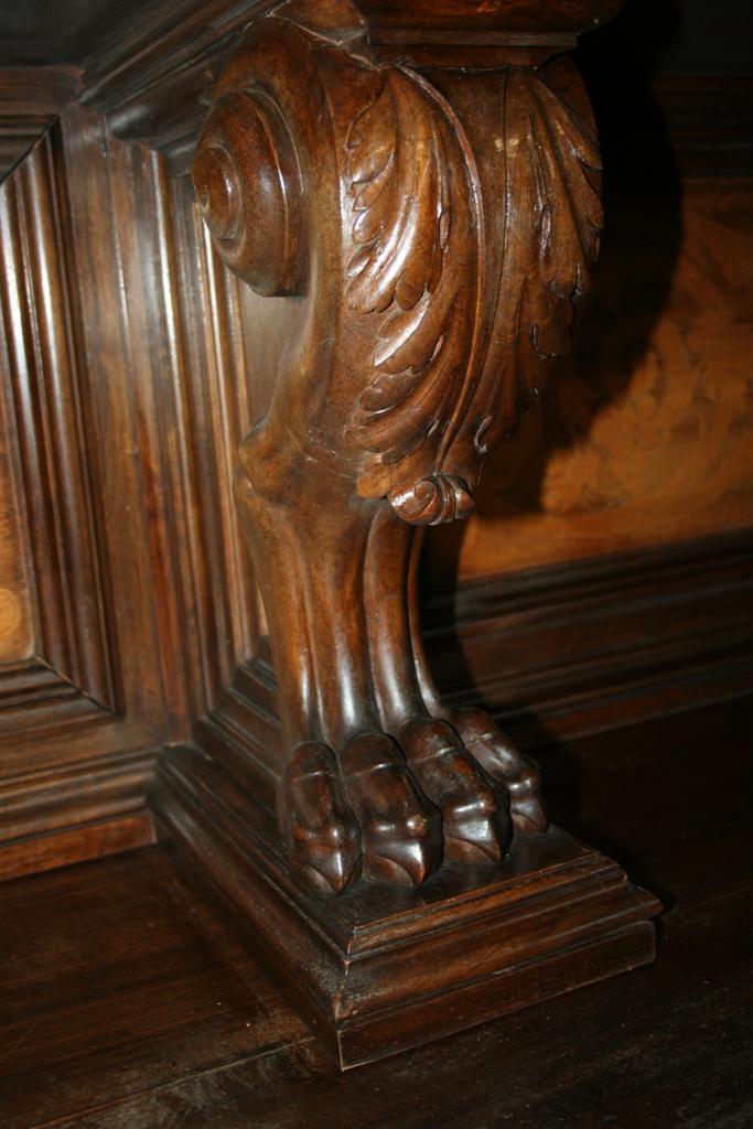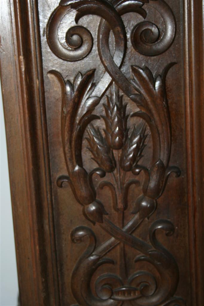 Credenza bolognese in due corpi, in noce con intagli stile caccia, vetrina nella parte superiore, fine '800