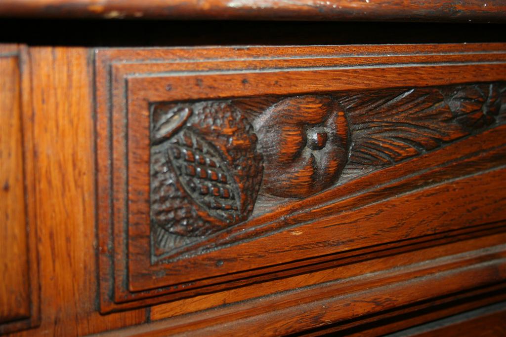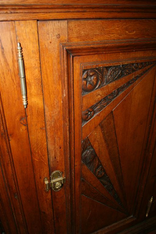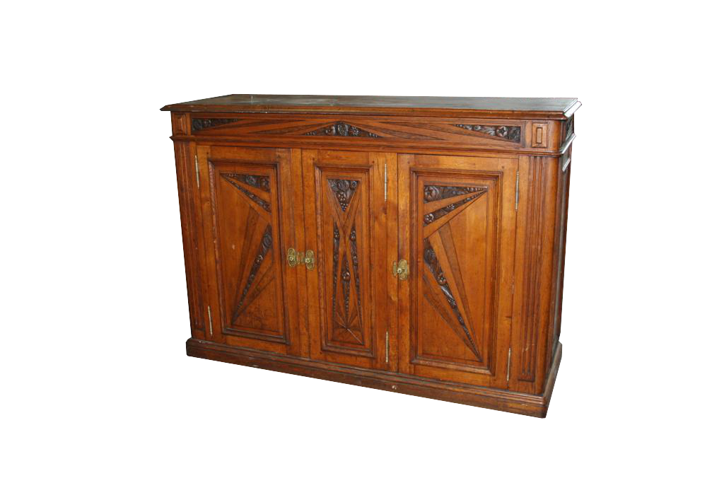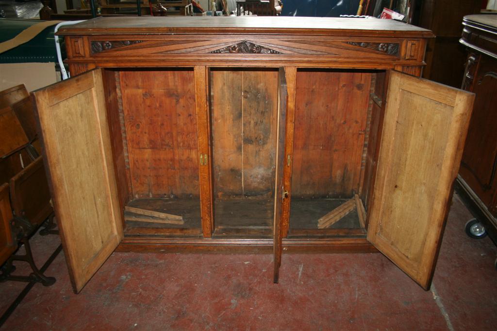 Credenzone francese liberty a 3 ante, in legno di quercia, con intarsi e finiture in ottone.