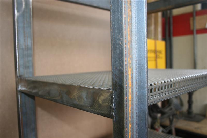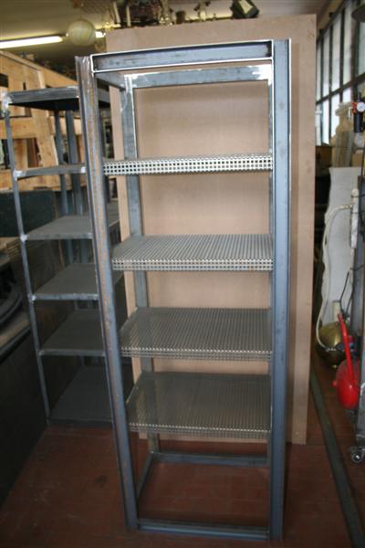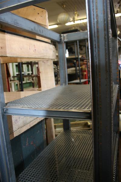 Camiciera etagere in ferro con ripiani di rete forata.