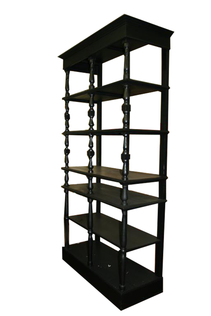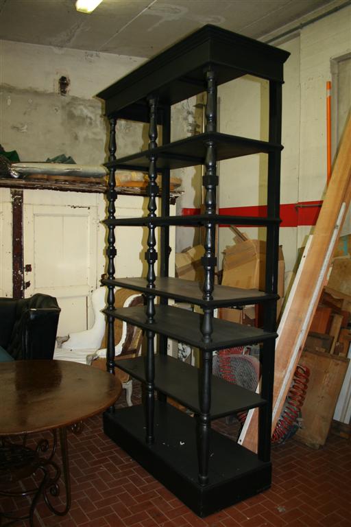 Grande libreria etagere senza schiena con colonnine tornite. In legno di larice laccato nero lucido. Italia anni '40.