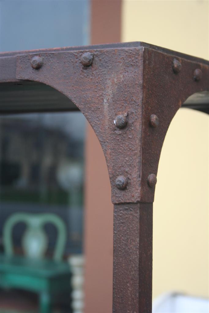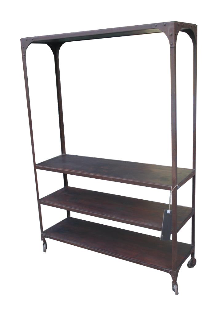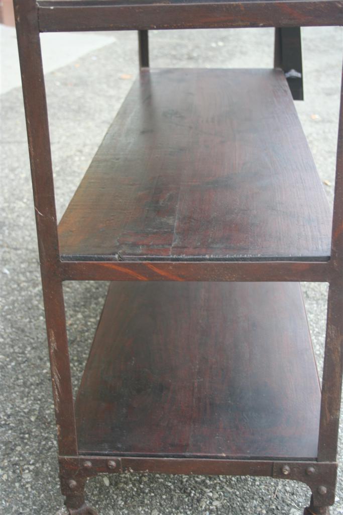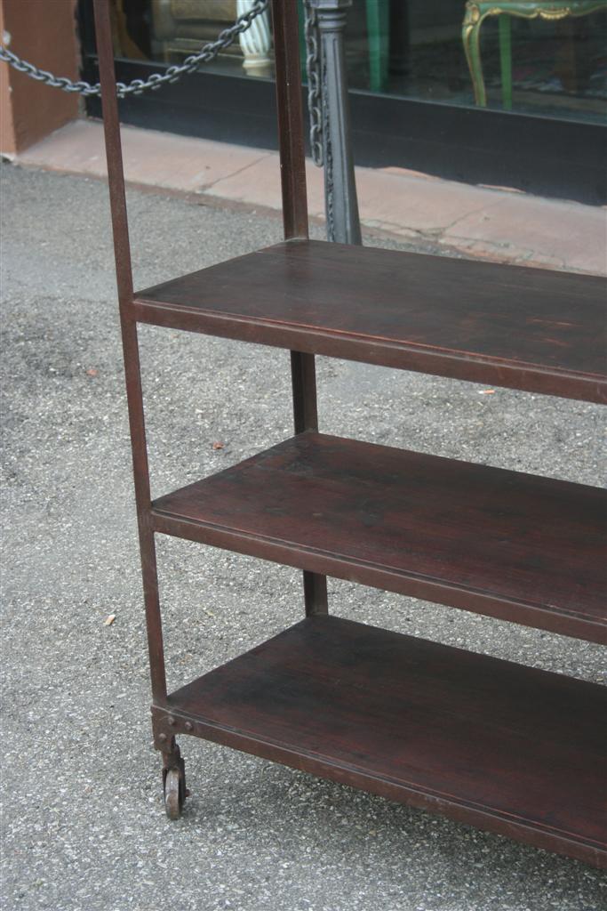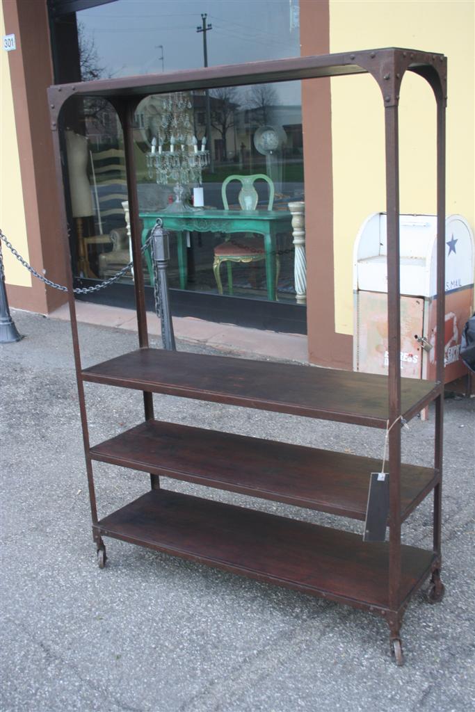 Etagere espositiva da negozio, con struttura e ruote in ferro e mensole legno di teak massello.