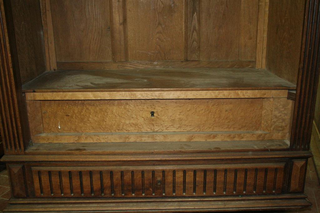 Libreria a giorno in legno dolce con cassetto nella parte inferiore.