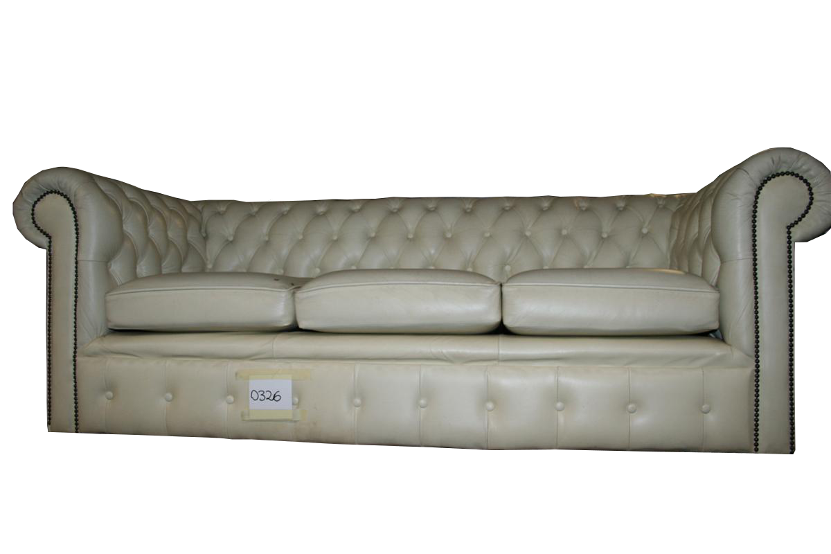 Divano chesterfield vintage inglese a tre posti, con capitonnèe in pelle color panna, su ruote.
