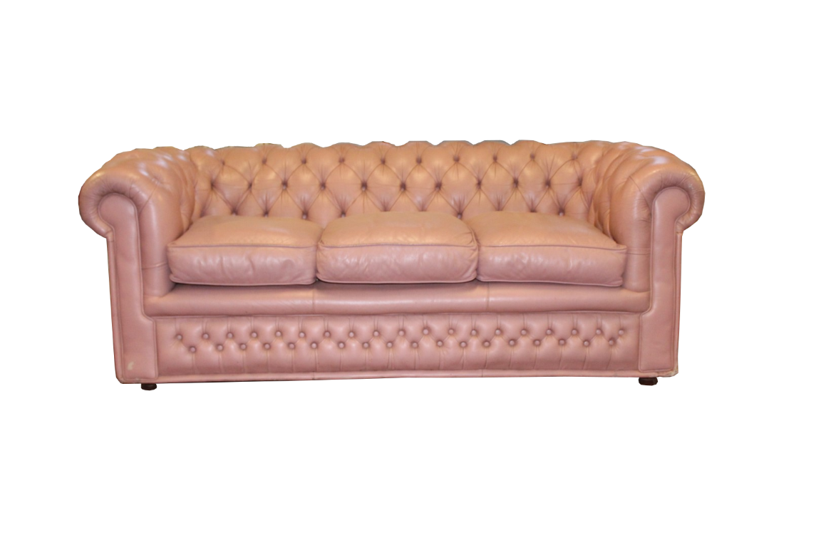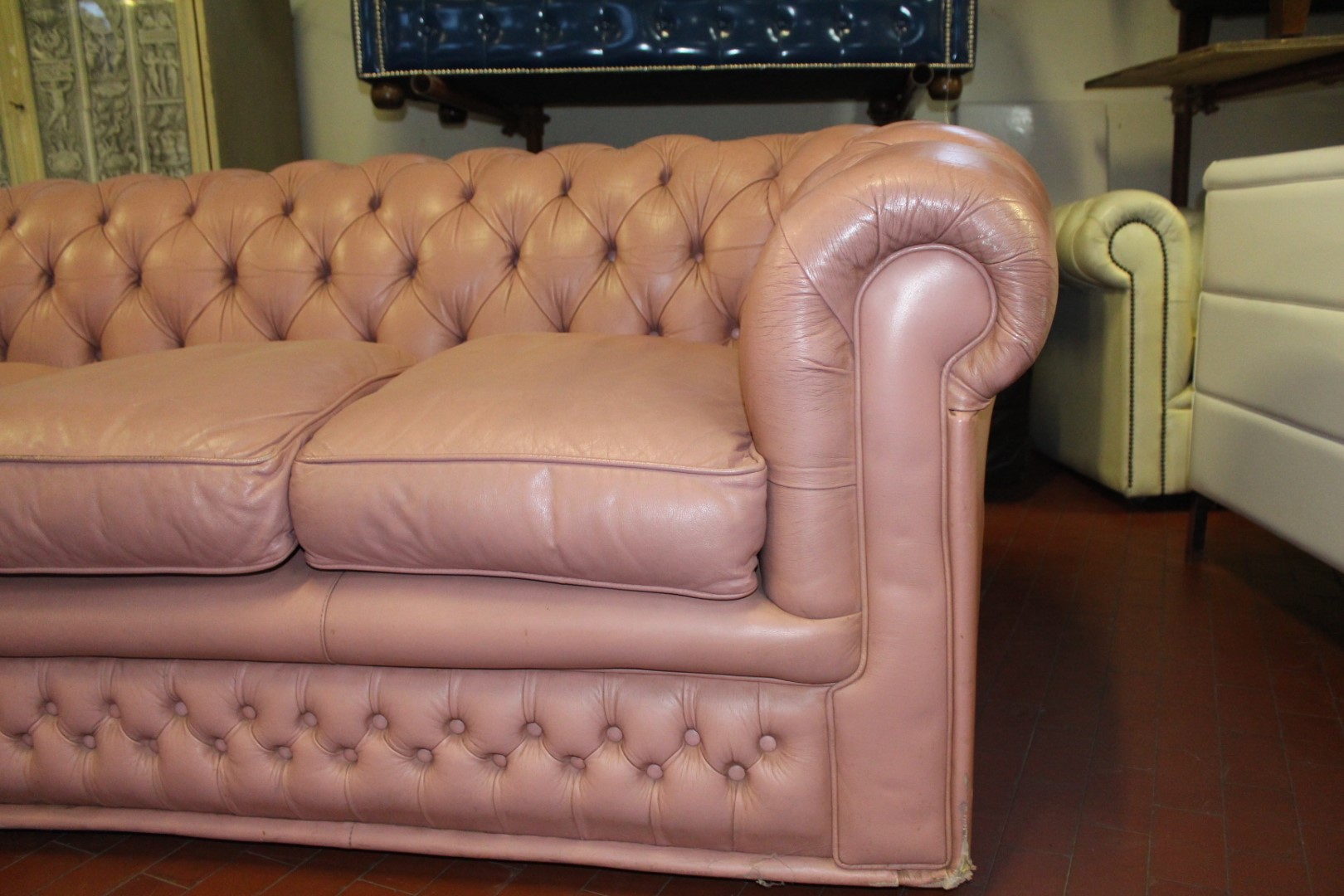 Divano chesterfield capitonnèe vintage francese a tre posti con rivestimento in pelle rosa.