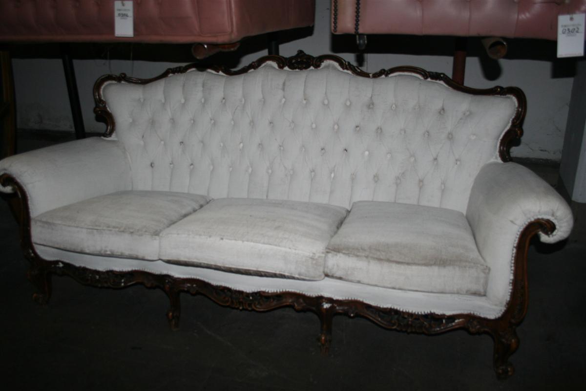 Divano chippendale a tre posti in legno di noce, con rivestimento in velluto sbiancato con capitonèe.