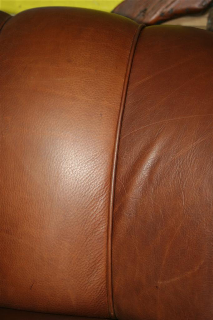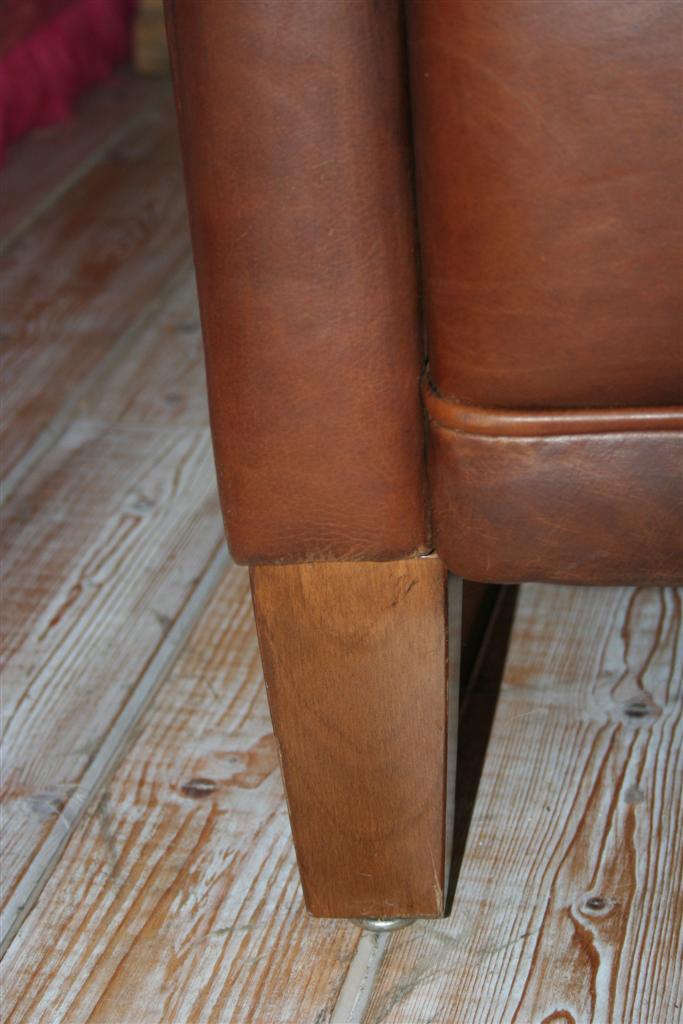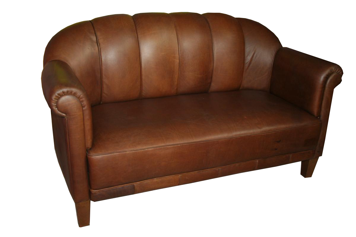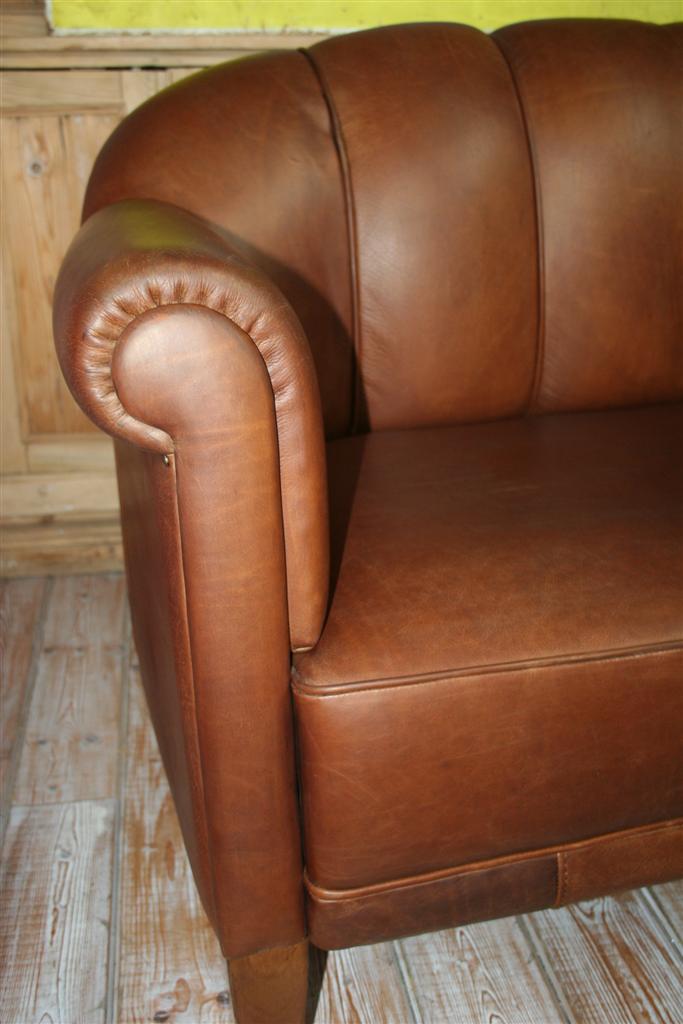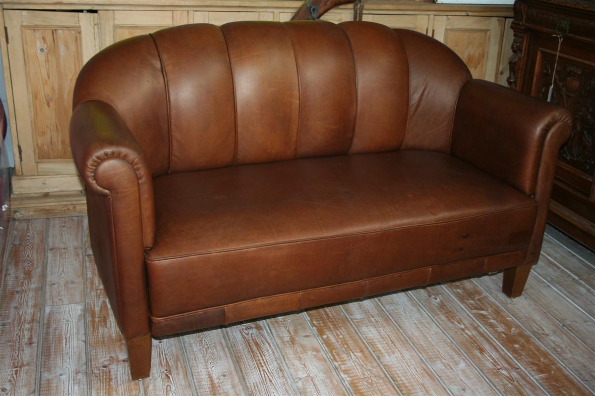 Riproduzione fedele in stile di divanetto club due posti belga anni '40, con schienale a conchiglia, in pelle marrone.