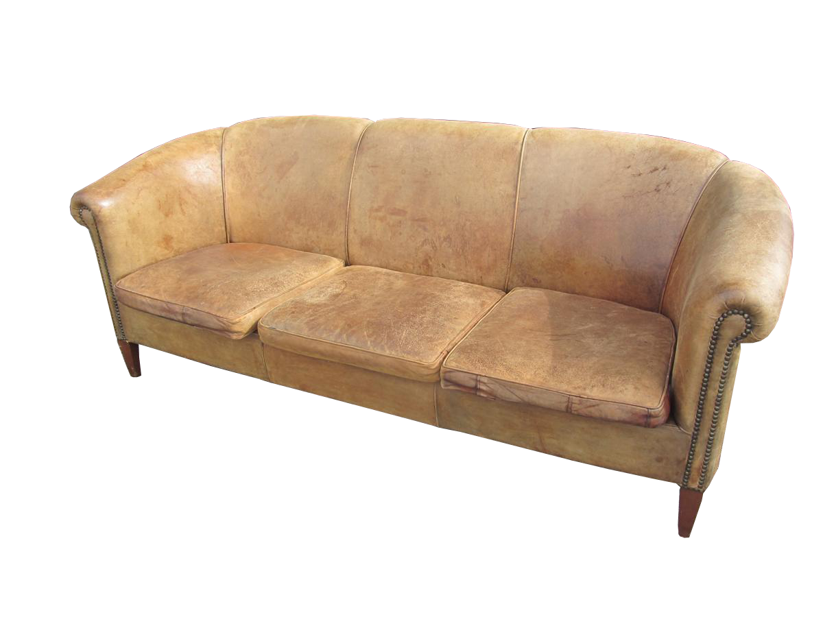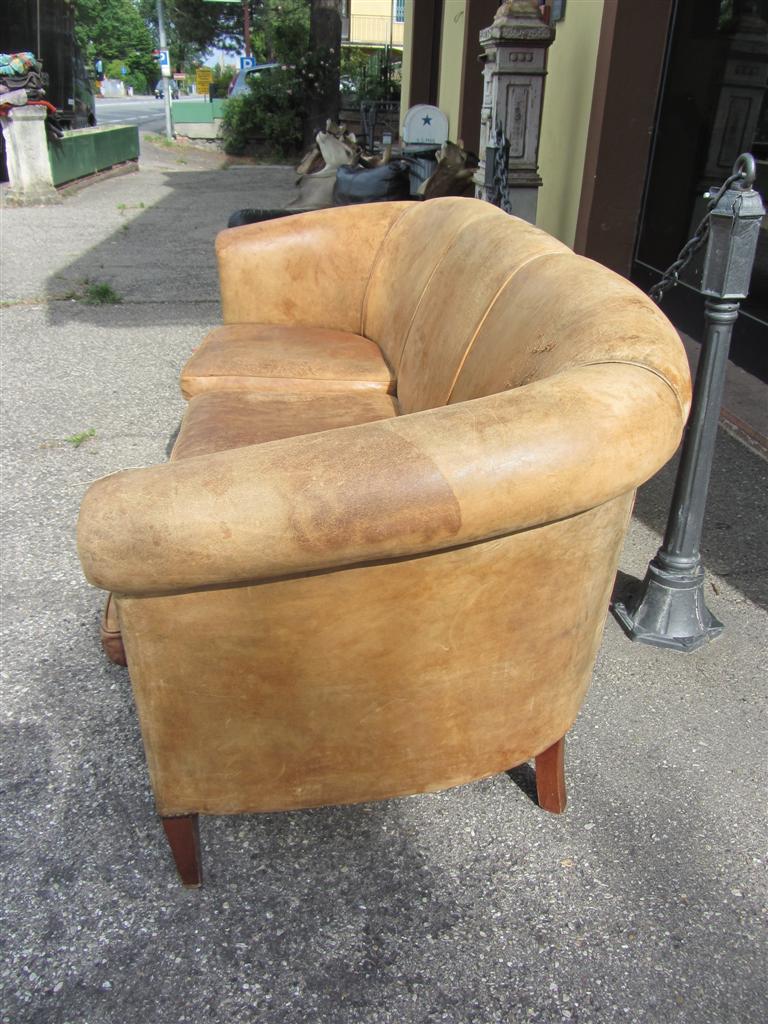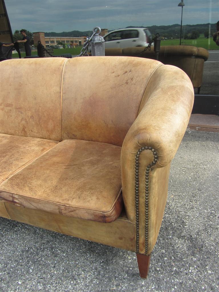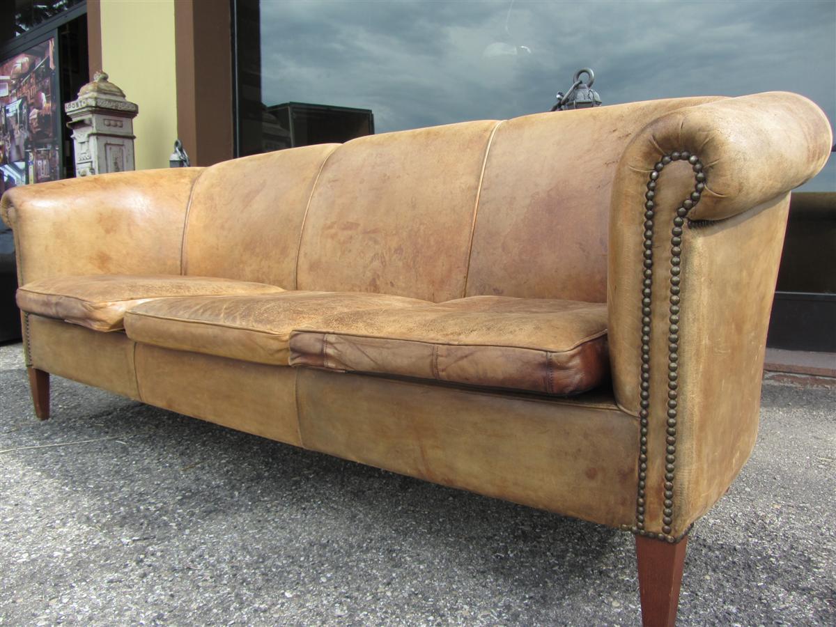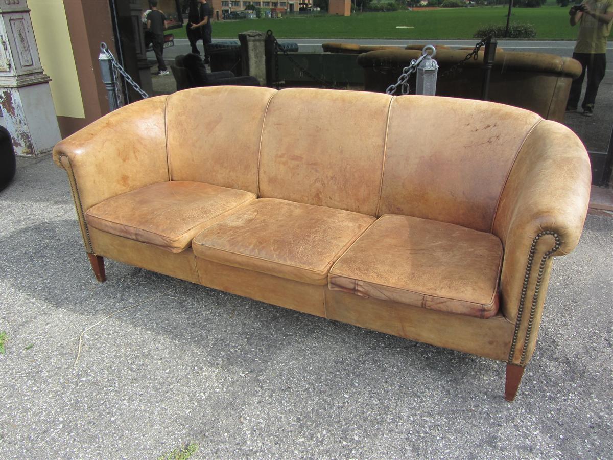 Divano club vintage belga originale anni '40 in pelle marrone, tre posti.