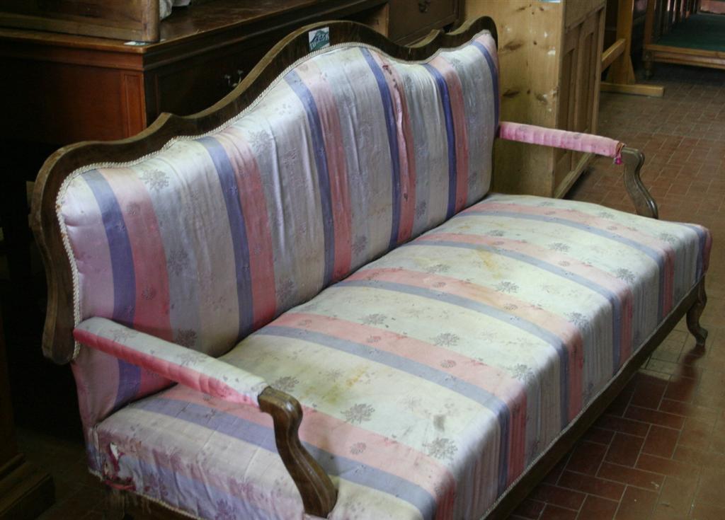 Divano dormeuse con struttura in radica e rivestimento tessuto decorato.