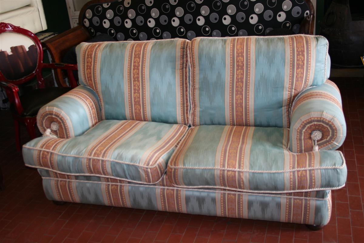 Divano due posti king size, rivestito in stoffa damascata azzurra.