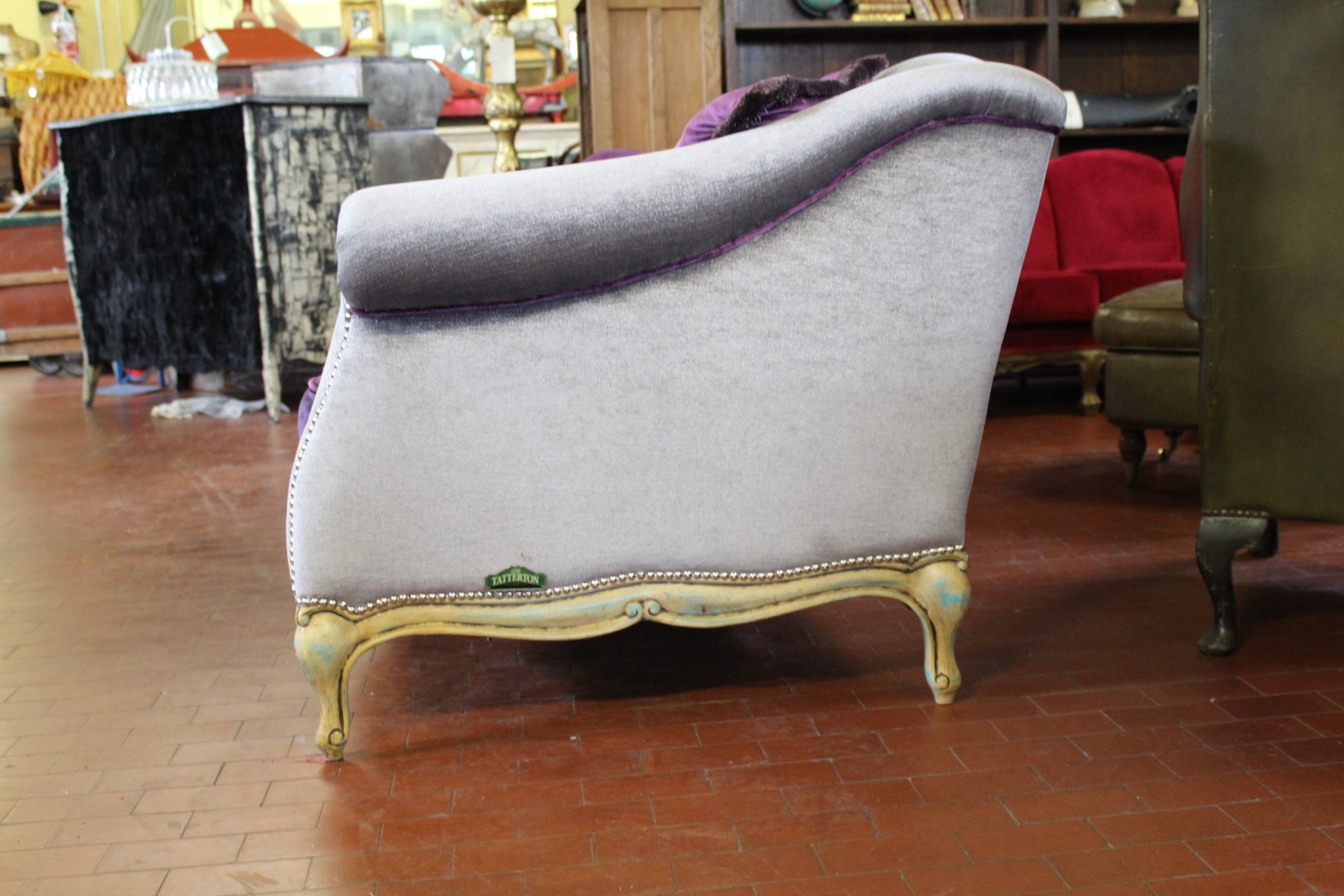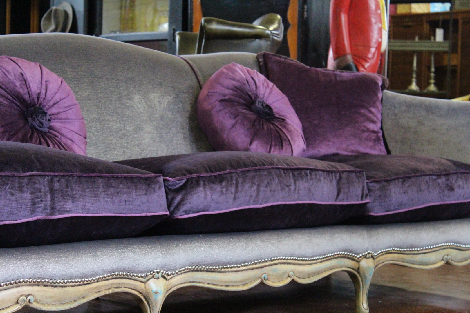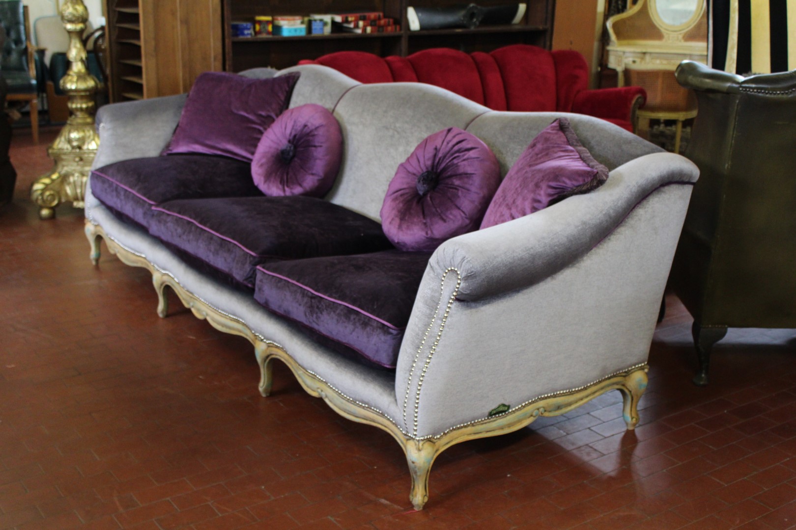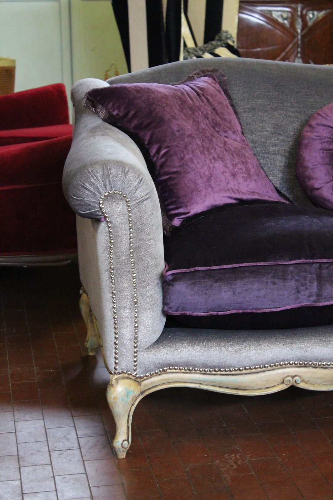 Divano 4 posti modello Luxury, in velluto color carta da zucchero con cuscini coordinati.