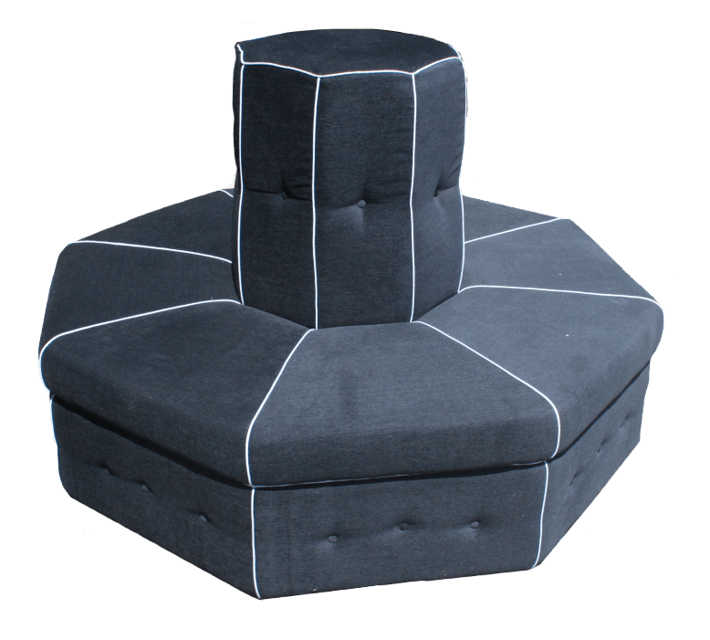 Divano da centro a forma ottagonale, rivestito in tessuto nero con rifiniture argento.