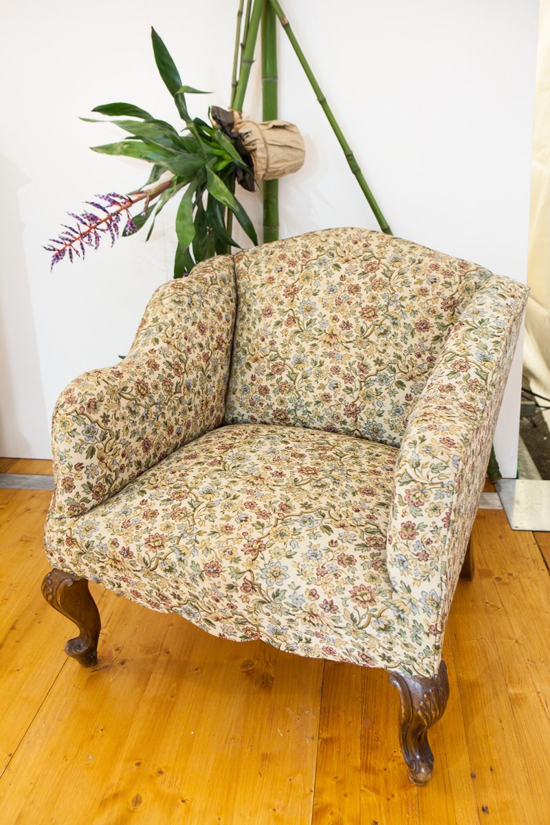 Poltrona club rivestita in stoffa con decori floreali e con piedi in noce.