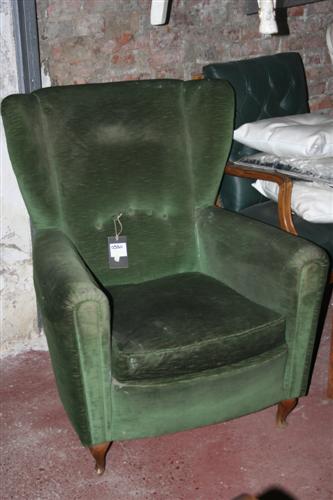 Poltrona club decò vintage in velluto verde, con bottoni sullo schienale e piedi in legno di noce