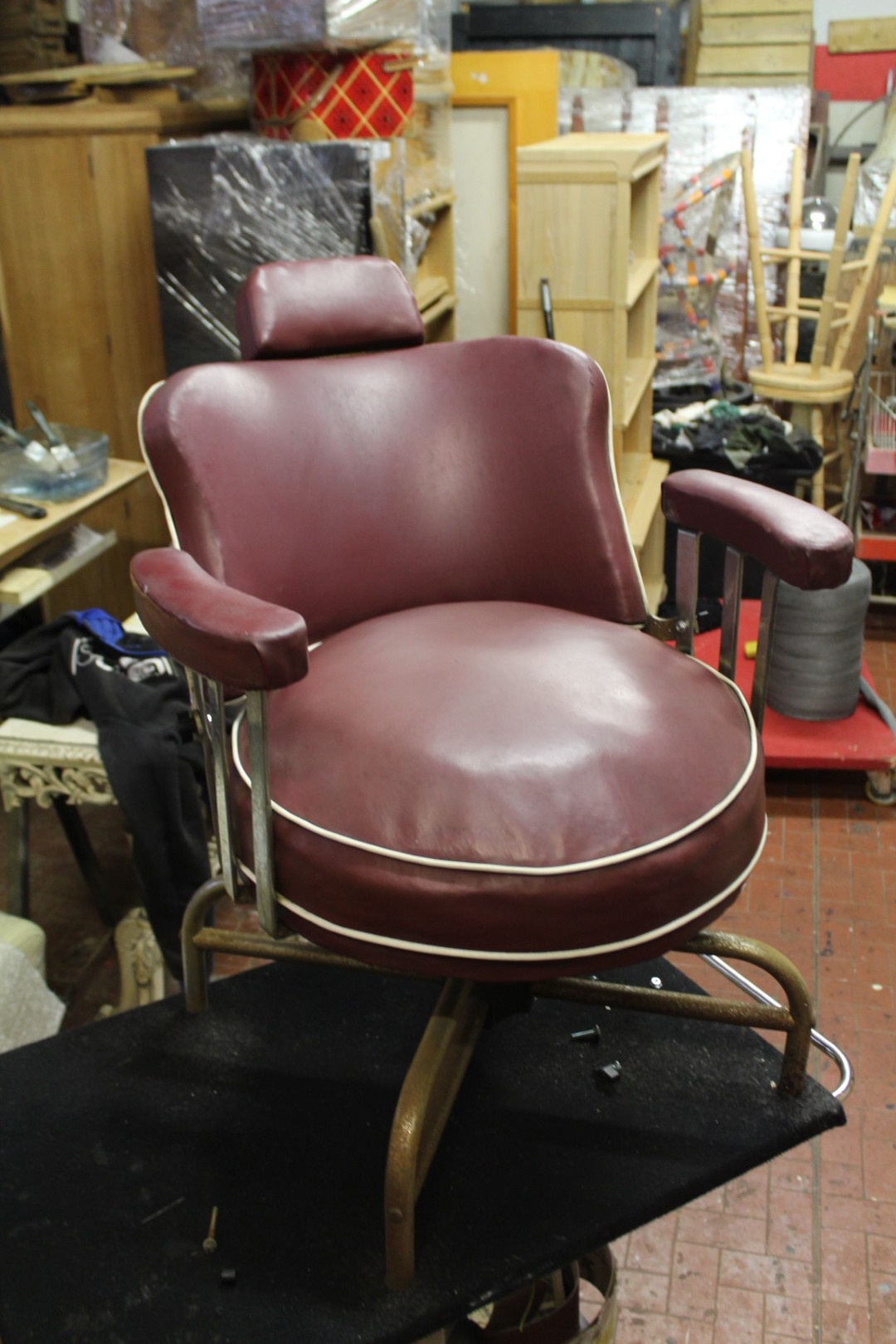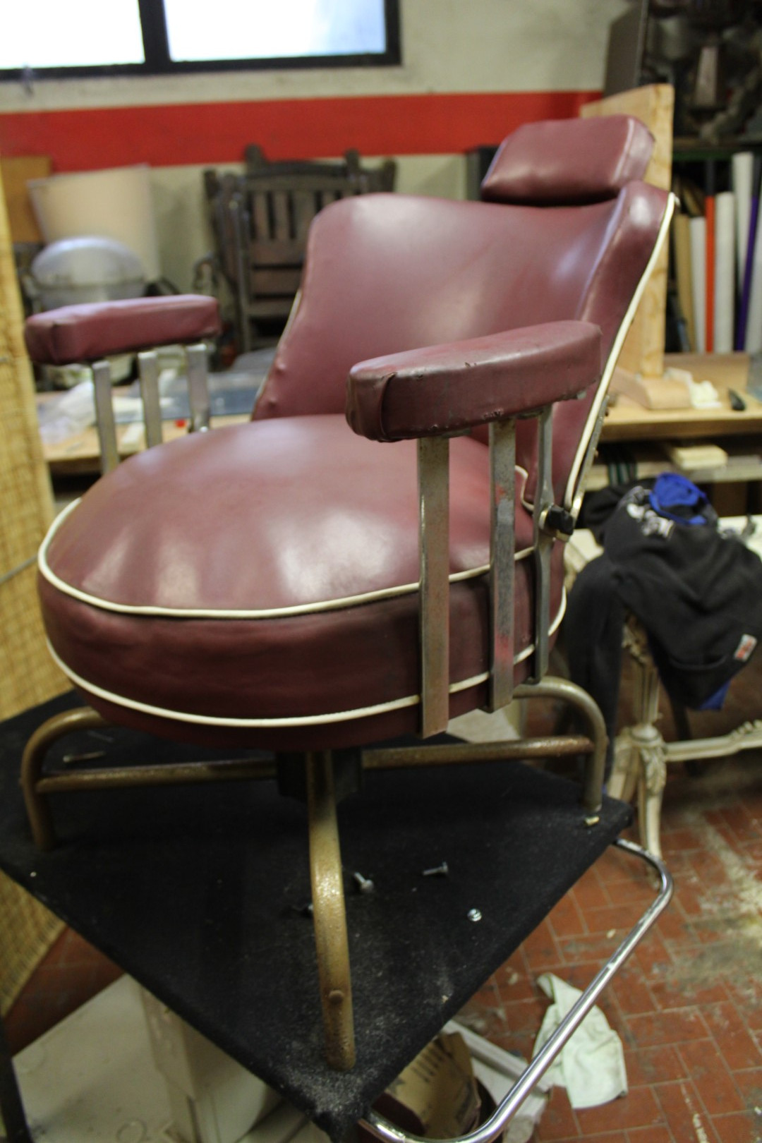 Poltrona da barbiere vintage anni '70.con struttura in acciaio cromato e rivestimento in pelle bordeaux.