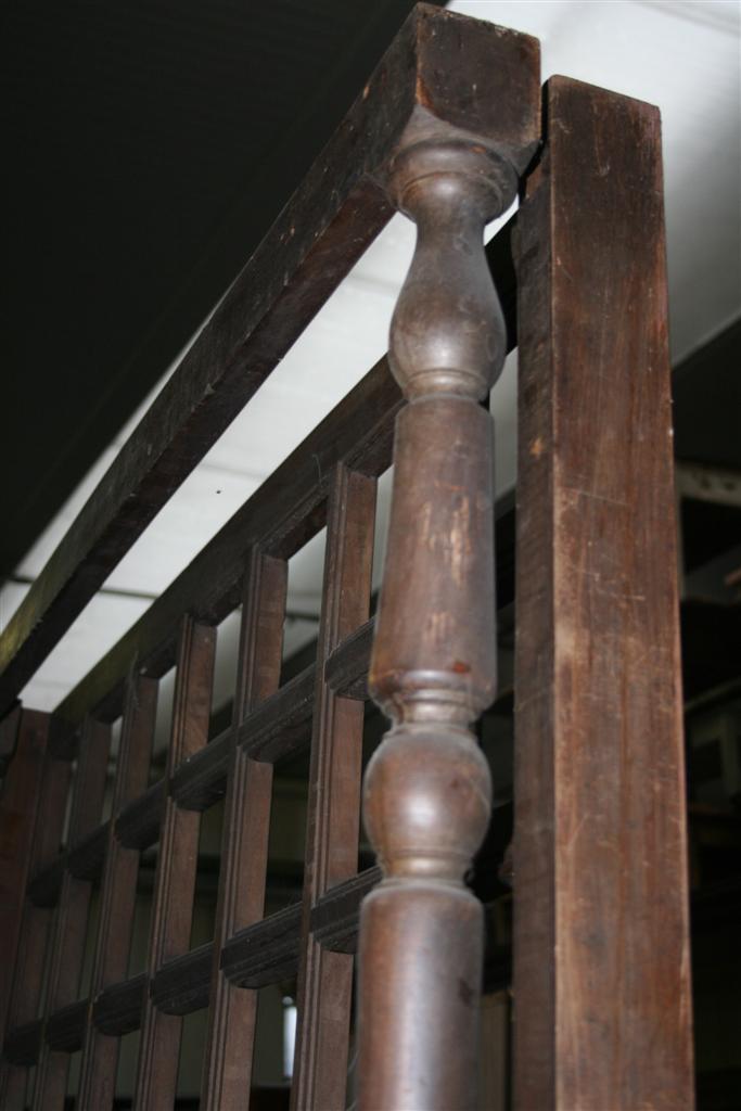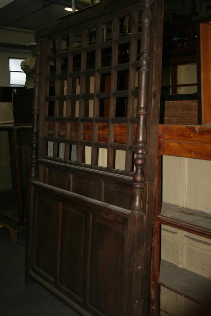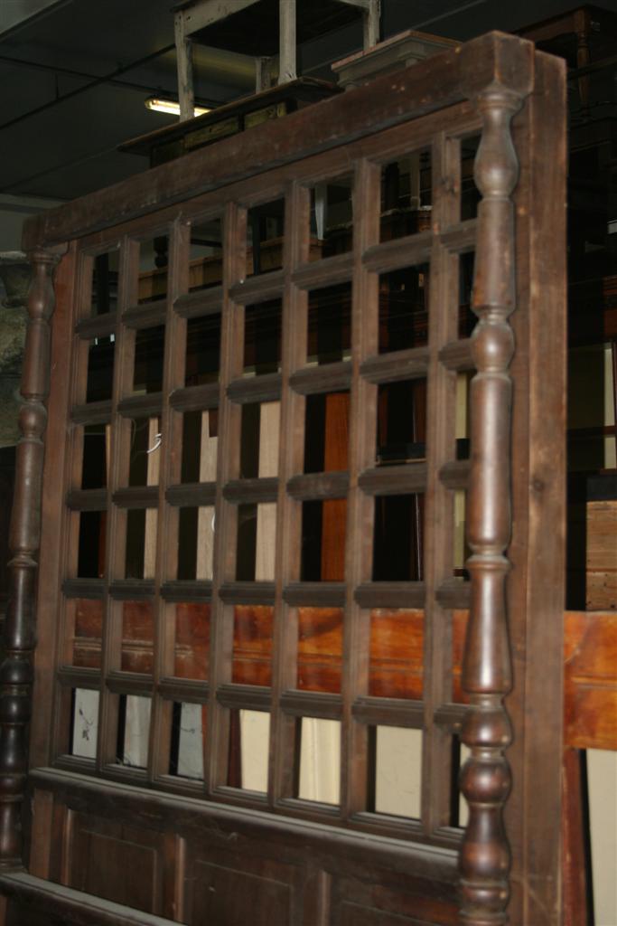 Letto a baldacchino vintage ad una piazza e mezzo con colonnine tornite e gliglia in legno nella testata.