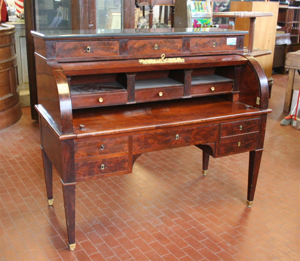 Secretaire bureaux impero in piuma di mogano, con ribaltina e marmo nero. Epoca secondo impero.