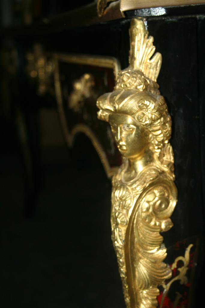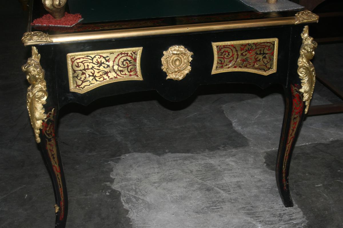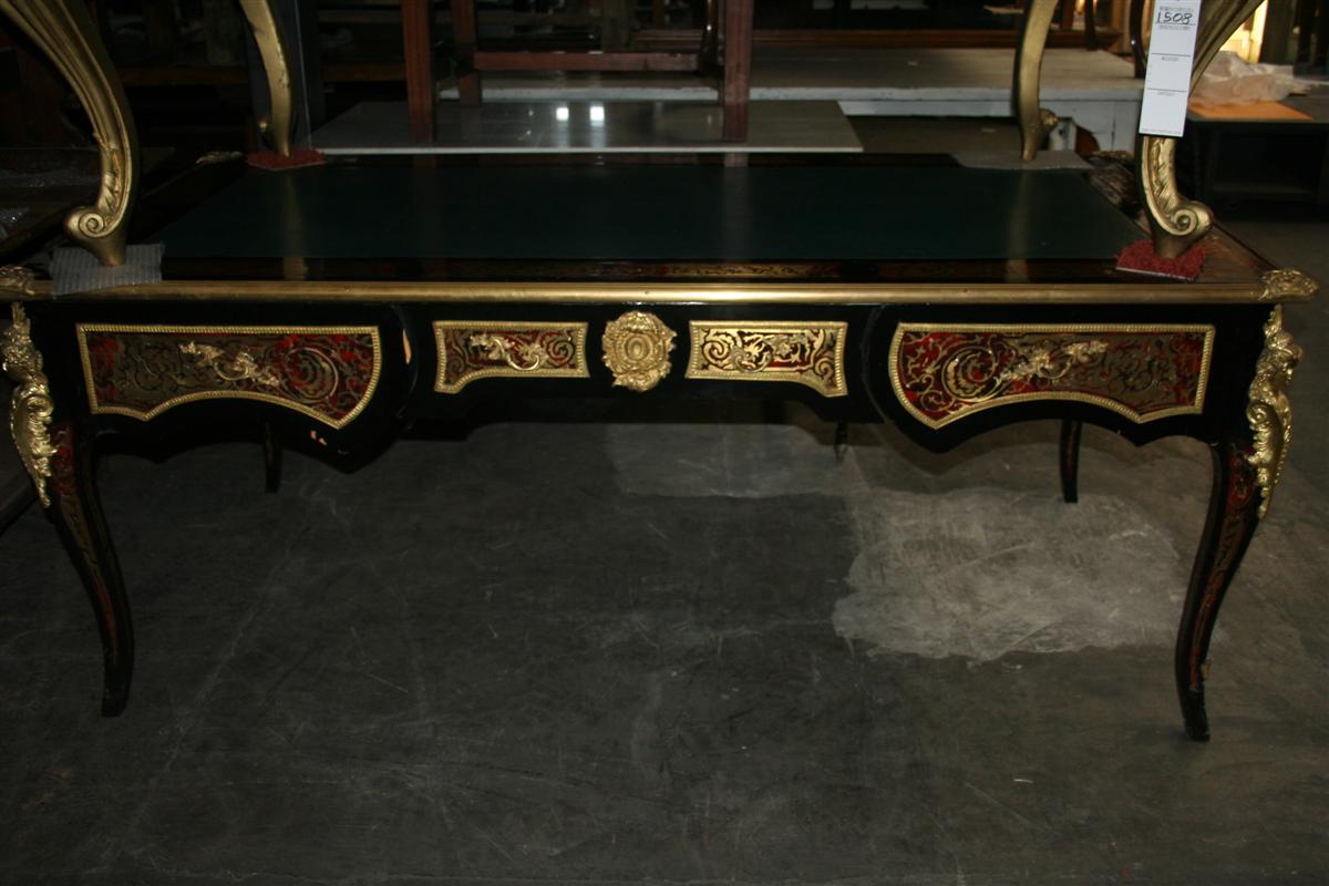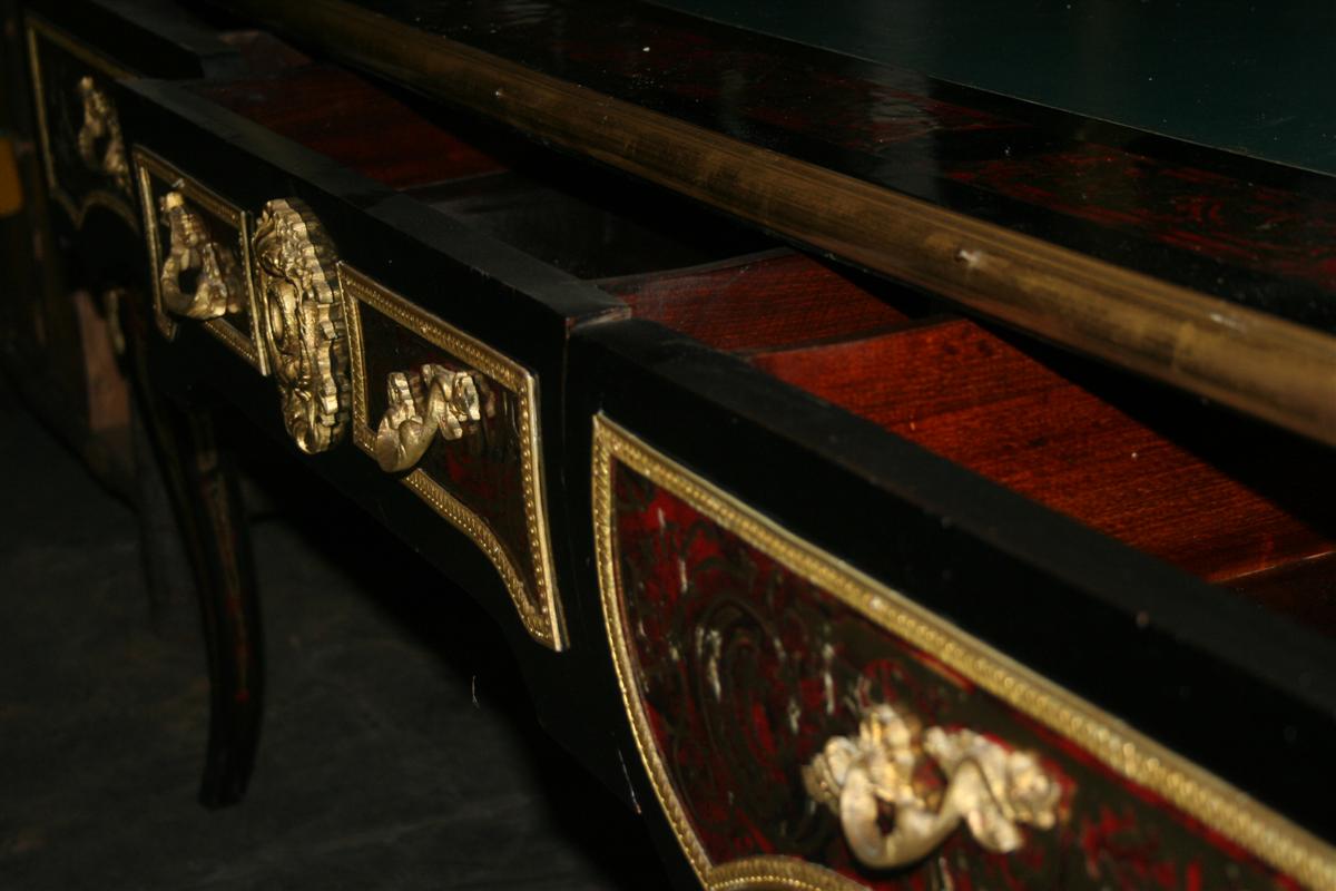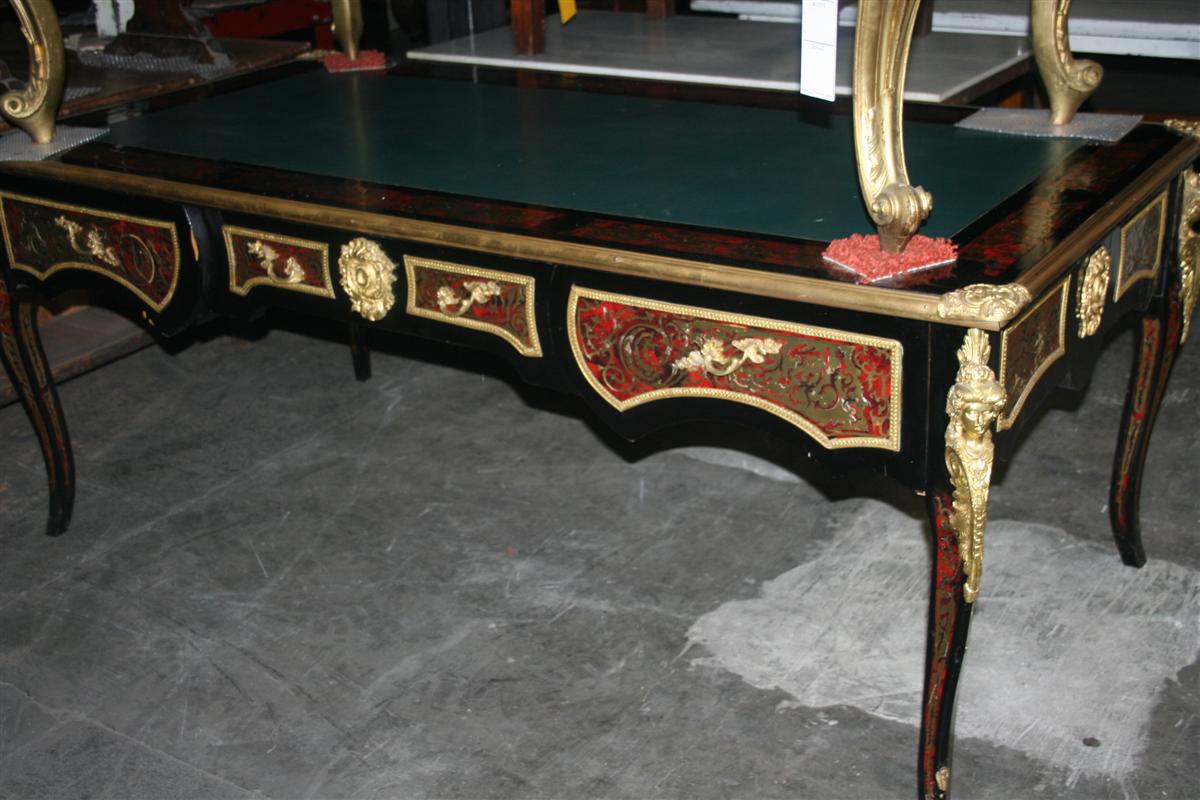 G&H Tatterton Best antique store Riproduzione di scrittoio sorrentino Luigi XV, con intarsi e decori in ottone e madreperla e piano in pelle verde.