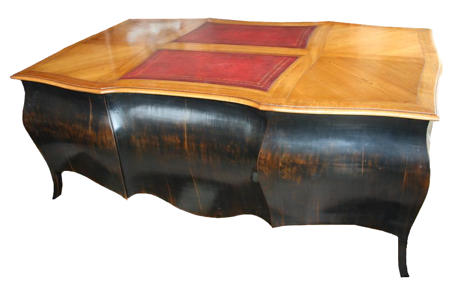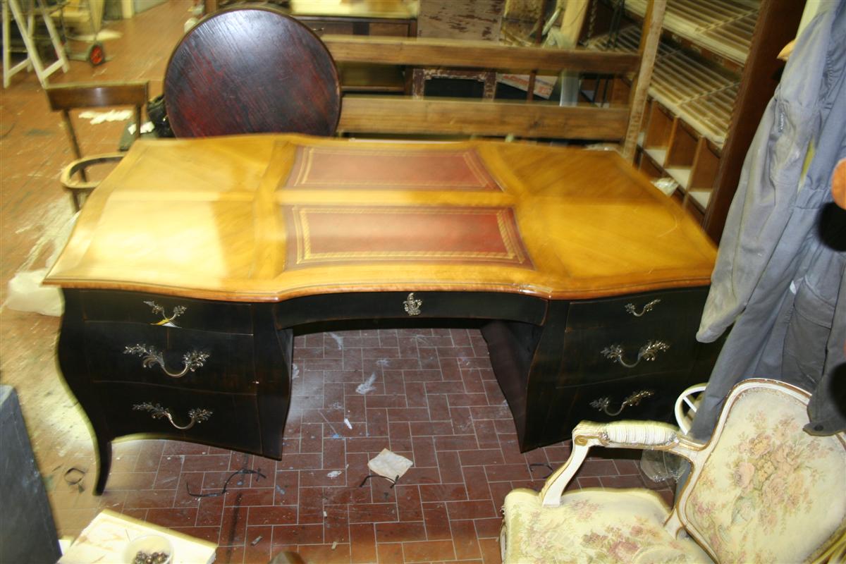 G&H Tatterton Best antique store Scrivania bombata stile Rococò rivisitato, in ciliegio e noce, con inserti in pelle bordeaux nel piano e doppia fila di cassetti.