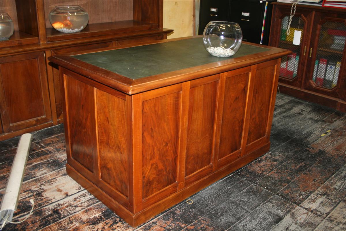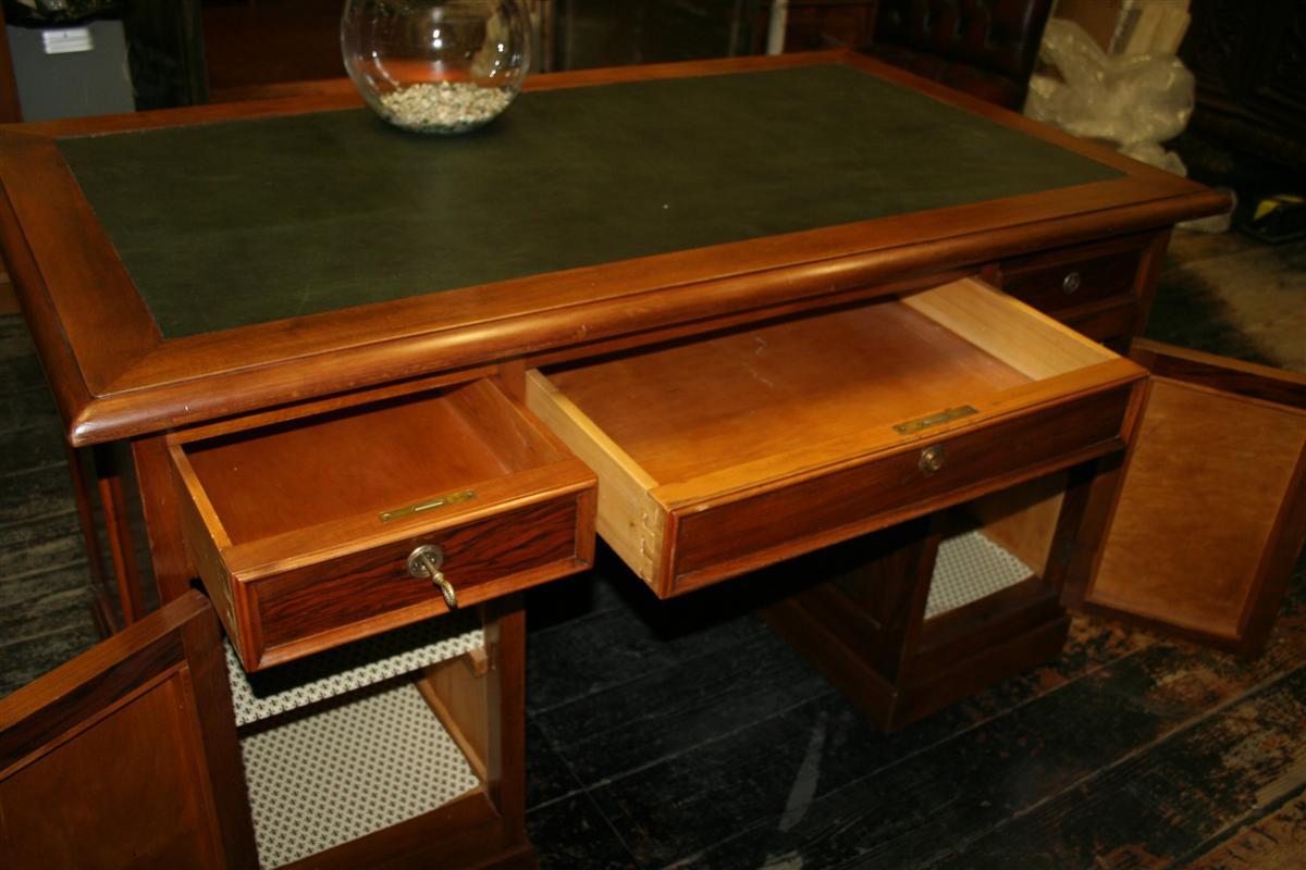 Scrivania ministeriale in rovere con piano rivestito pelle verde. Dotata di 3 cassetti e 2 ante.